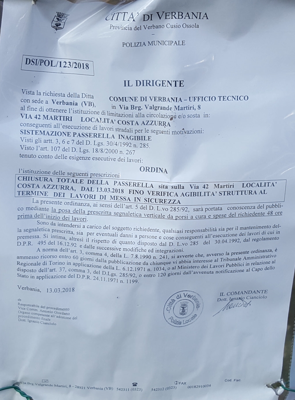 A oggi il ponticello in legno in località Costa Azzurra è transennato, chiuso, off limits e s’accompagna al cartello “è fatto divieto assoluto di accesso alla passerella per l’inagibilità della stessa”. Lo dice l’ordinanza Dsi/Pol/123/2018, che sul sito internet del comune di Verbania non è pubblicata e che possiamo mostrare perché è stata fotografata oggi a Fondotoce (leggi qui).