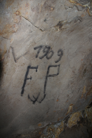 All'interno abbiamo trovato alcune scritte realizzate cent'anni prima dai minatori con le lampade a carburo, indicanti date e iniziali di chi vi lavorò, oltre a reperti come strumenti di lavoro dei minatori e tramogge di scarico del minerale aurifero, in perfetto stato di conservazione. Una di queste scritte riporta 1909 FP.