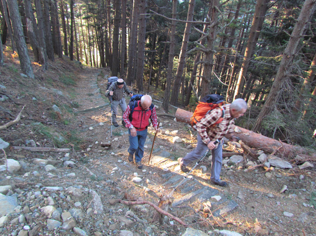 Una giornata stupenda, con il giusto fresco mattutino di inizio ottobre, vede parcheggiare in località Promez di Toceno, 926, quattro superstiti di un glorioso gruppo, giustamente prudente vista l’età media elevata. Il Covid non ci vuole lasciare. Imbocchiamo la bella mulattiera M25 della GTA ed incappiamo quasi subito in una pista agro – silvo – pastorale (termine “burocratico” che tanto detesto) in costruzione. Chissà dov’è diretta? Forse alla Piana? Se lo scopo di queste piste è riattivare l’attività agro – silvo – pastorale, direi che è fallito. Senza queste, negli anni passati, l’attività era molto più fervida di adesso. Sembra che il risultato più tangibile sia quello di avvicinare comodamente le baite ai proprietari, ecc…..