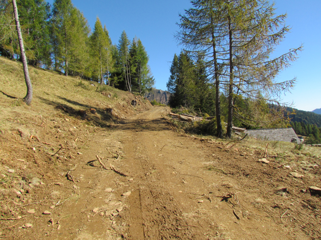 Passando di fianco al Ratagin ricordiamo con piacere e nostalgia gli ottimi pranzi che, qualche anno fa, ci preparava un bravo ragazzo che, purtroppo, è andato avanti. Dalle case, diretto a oriente, parte l’evidente sentiero M25b che, in meno di mezz’ora, ci porta a La Colma di Craveggia. Le meraviglie tutt’intorno e la compagnia mi avevano restituito il buonumore, ma dura poco. Anche qui stanno costruendo, anzi prolungando, l’ennesima pista agro – silvo – pastorale. La Colma è già stata violata e adesso è il turno della sovrastante Alpe Pidella. Dove arriverà? Anni fa avevo già espresso grosse perplessità per la costruzione, allora “selvaggia”, della strada che saliva qui da Craveggia. Adesso non ho più parole. Vedrò più in basso, durante la discesa, che si tratta di un progetto di largo respiro: la regione aiuta il Comune a raggiungere gli alti pascoli nell’ottica di difendere suolo, montagna e foreste. Difendere??? C’era una canzone della grande Mina: “parole, parole, parole”. Peccato che siano anche scritte sul cartello dei lavori.