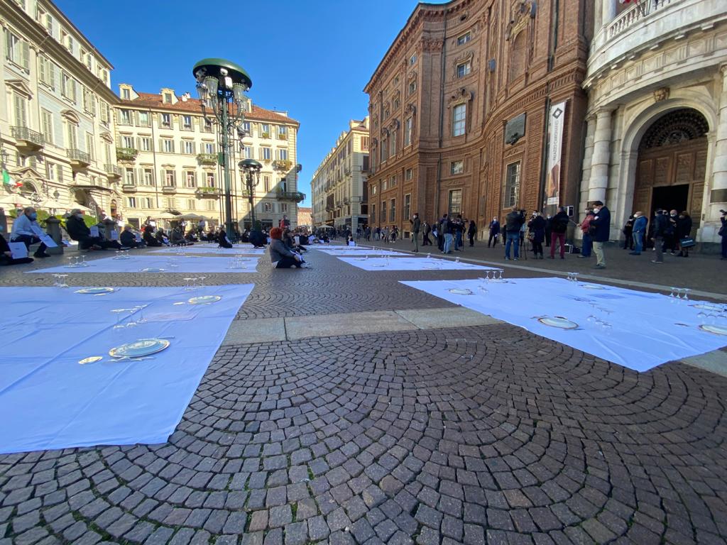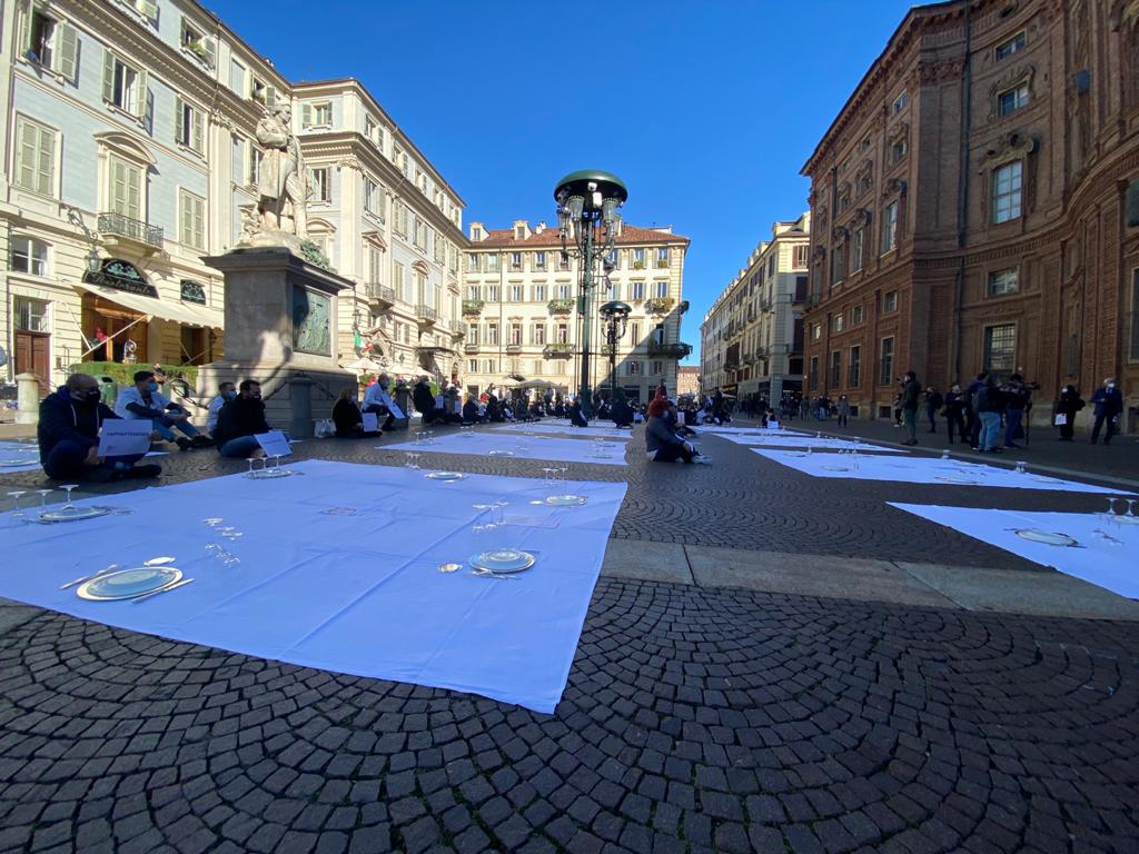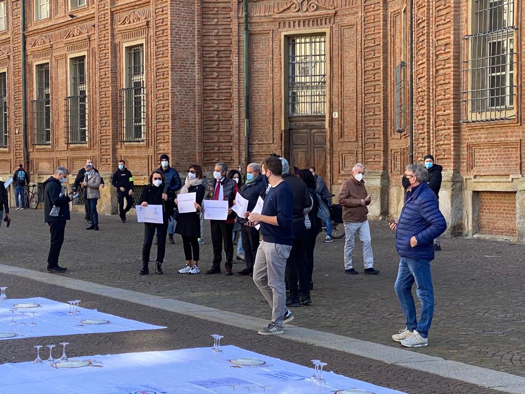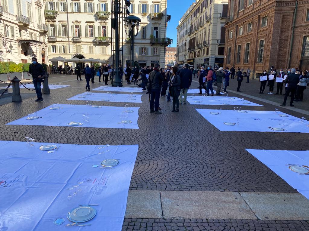 Fipe del Vco, guidata dal presidente AscomVco e vicepresidente di Confcommercio Alto Piemonte Massimo Sartoretti, in piazza a Torino mercoledì mattina per manifestare contro le limitazioni del Dpcm che colpiscono duramente varie categorie, tra cui i ristoratori. La protesta li ha portati ad”apparecchiare” simbolicamente la piazza.