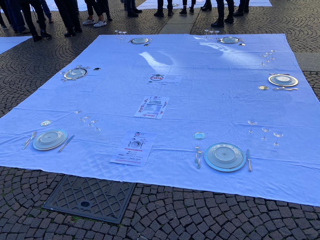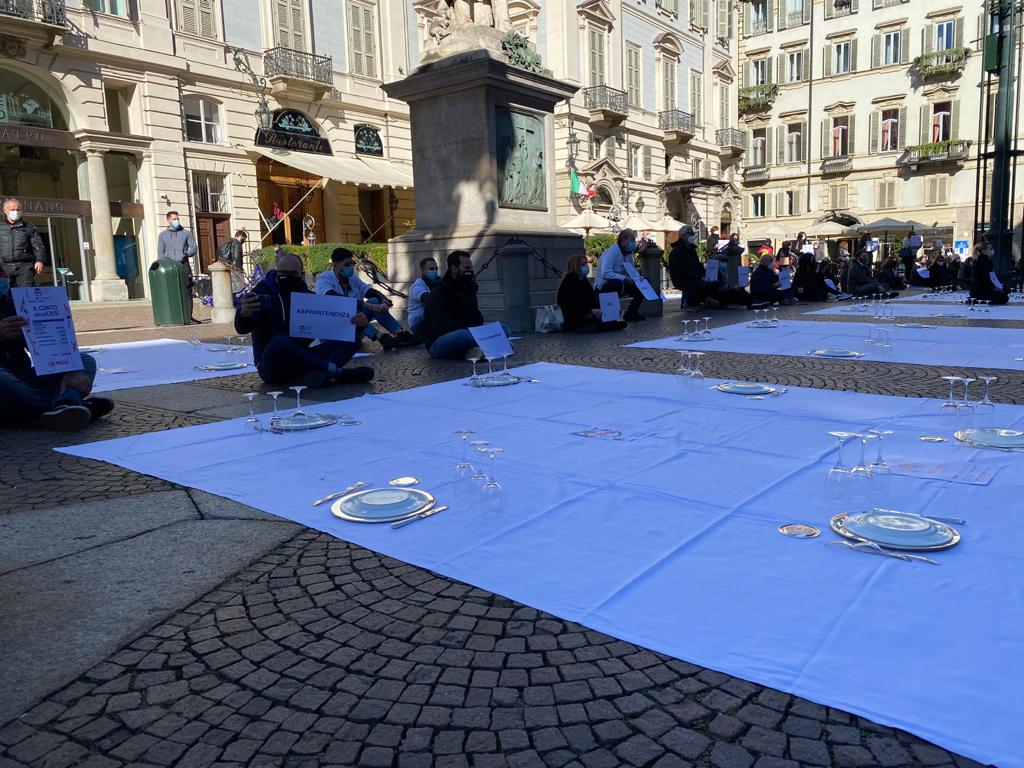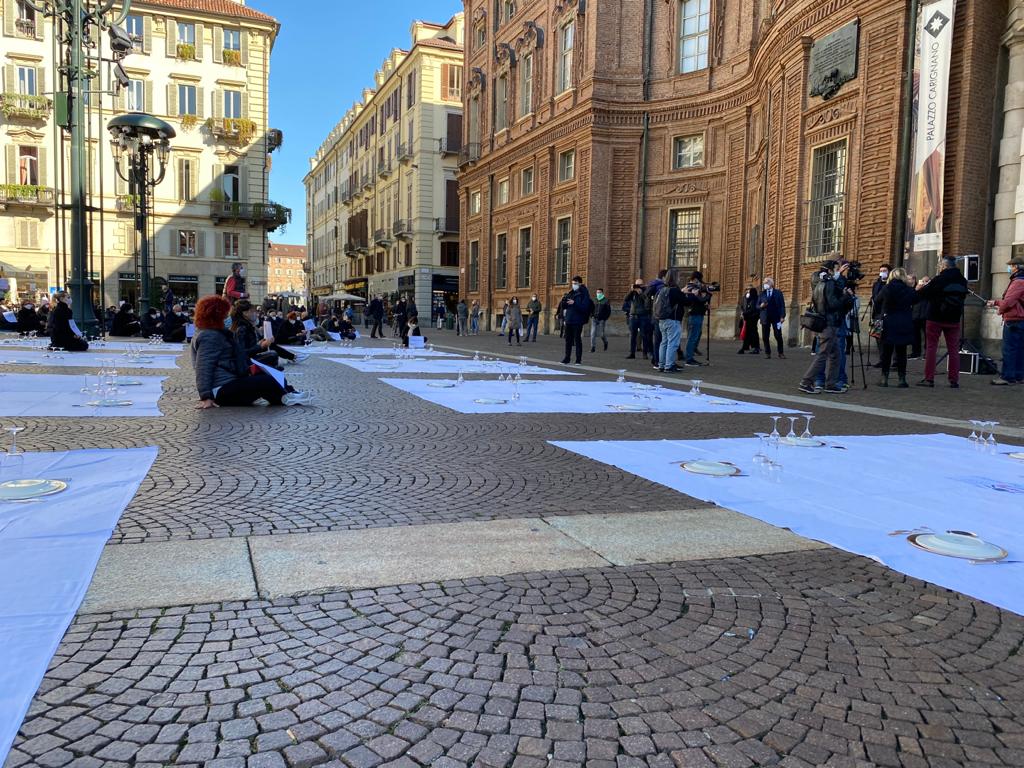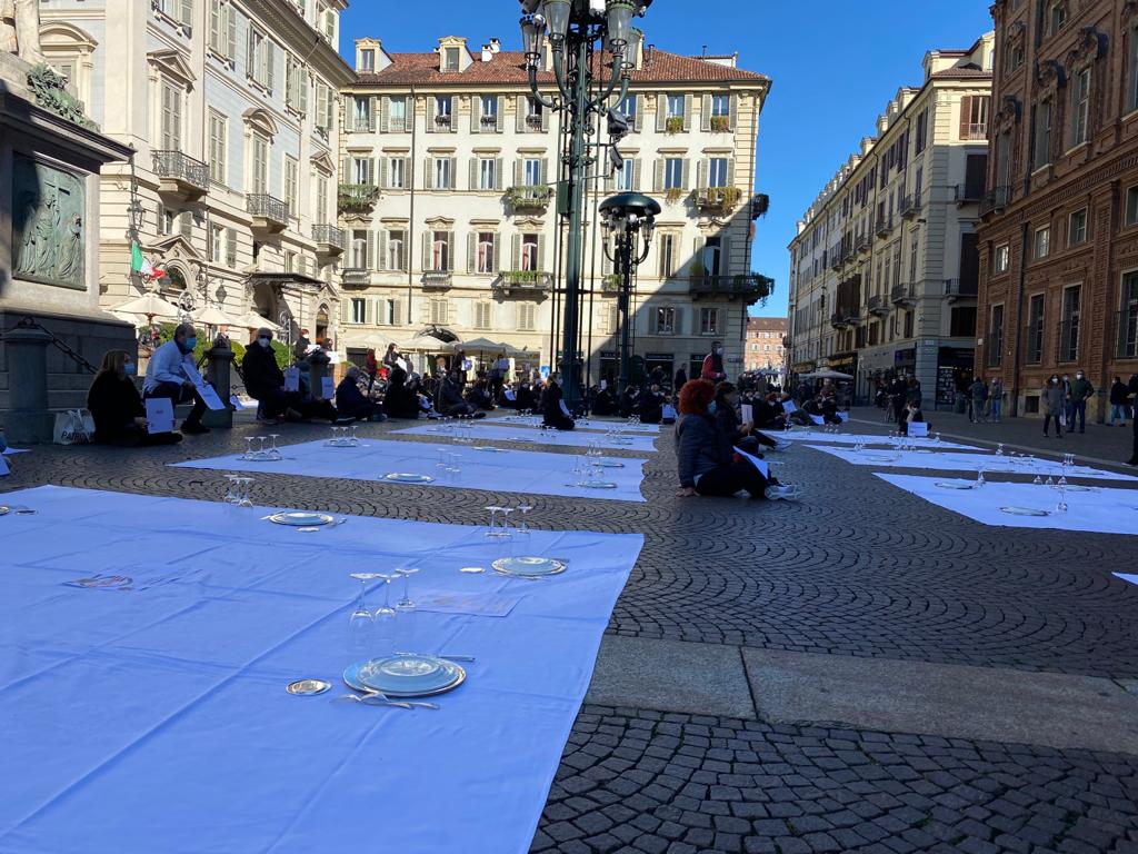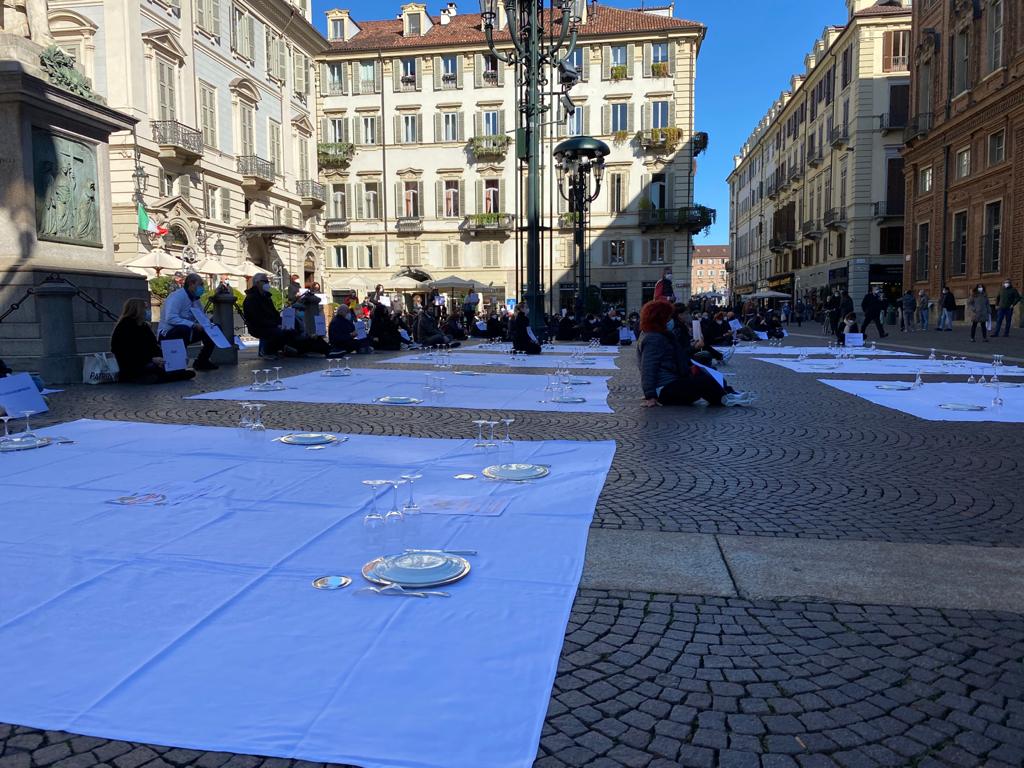 Fipe del Vco, guidata dal presidente AscomVco e vicepresidente di Confcommercio Alto Piemonte Massimo Sartoretti, in piazza a Torino mercoledì mattina per manifestare contro le limitazioni del Dpcm che colpiscono duramente varie categorie, tra cui i ristoratori. La protesta li ha portati ad”apparecchiare” simbolicamente la piazza.