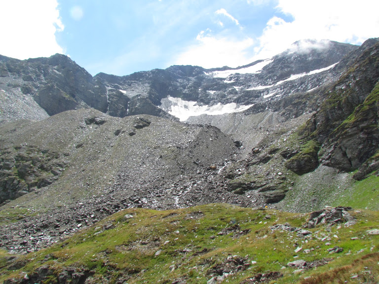 Ci concediamo una breve pausa e ripartiamo verso destra, attraversiamo il torrentello ed iniziamo a salire. Più in alto lasciamo alla nostra sinistra il lago più grande e più degno di tal nome. Gli altri due, ormai laghi solo sulle cartine, sono più in basso. A qualche sprazzo di sole si alterna la nebbia, anche abbastanza fitta, ma siamo ancora asciutti. Passiamo oltre un laghetto alla nostra destra e raggiungiamo il Passo di Sirwolte, 2621, dopo un’ora e un quarto. Solo con l’aiuto della buona conoscenza della zona, non certo della visibilità, torniamo verso oriente ed andiamo a prendere il sentiero che si trova sulla dorsale rivolta verso la Ritzitälli (che scende verso Engiloch). Prima ripido, poi in più dolce pendenza, questo ci porta in cima al Galehorn, 2797, in venti minuti. Il grande ripetitore di vetta è l’unica cosa che si intravvede.