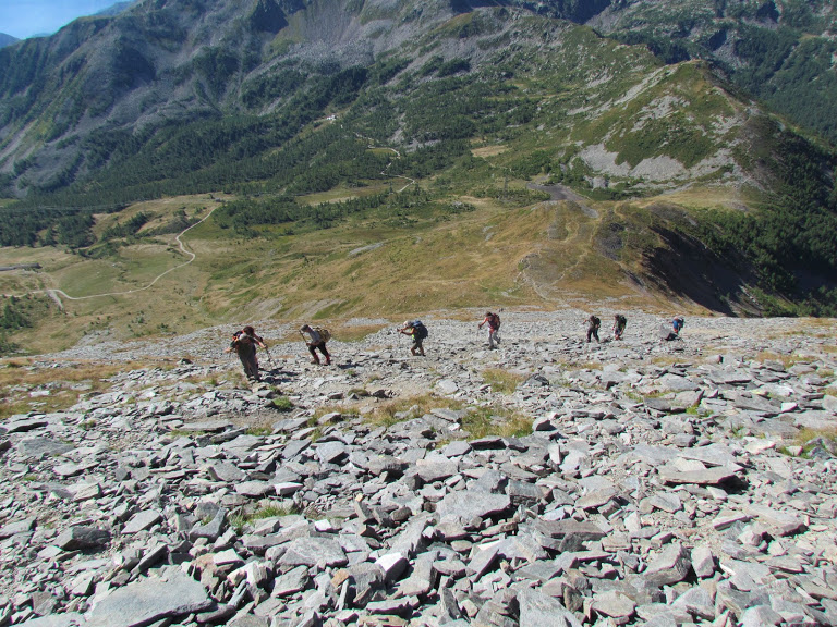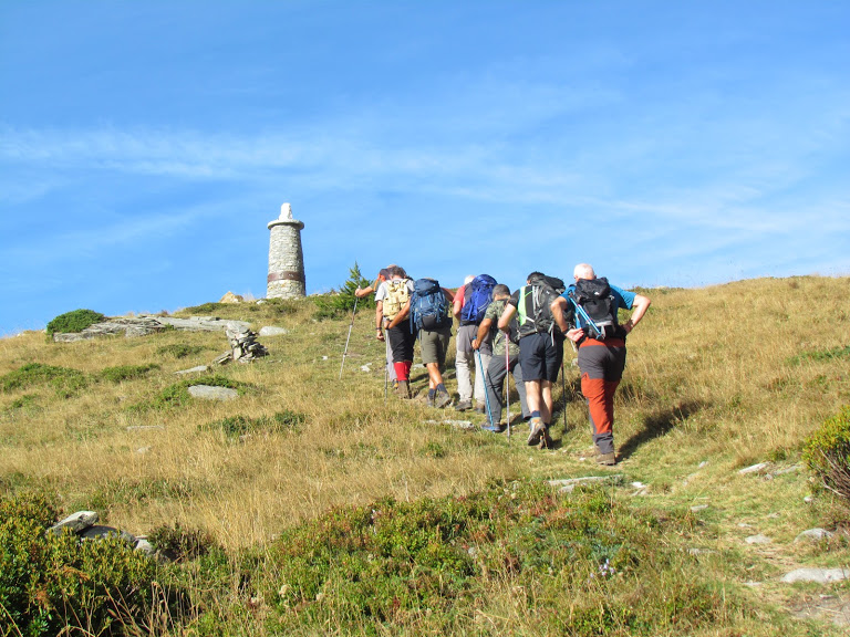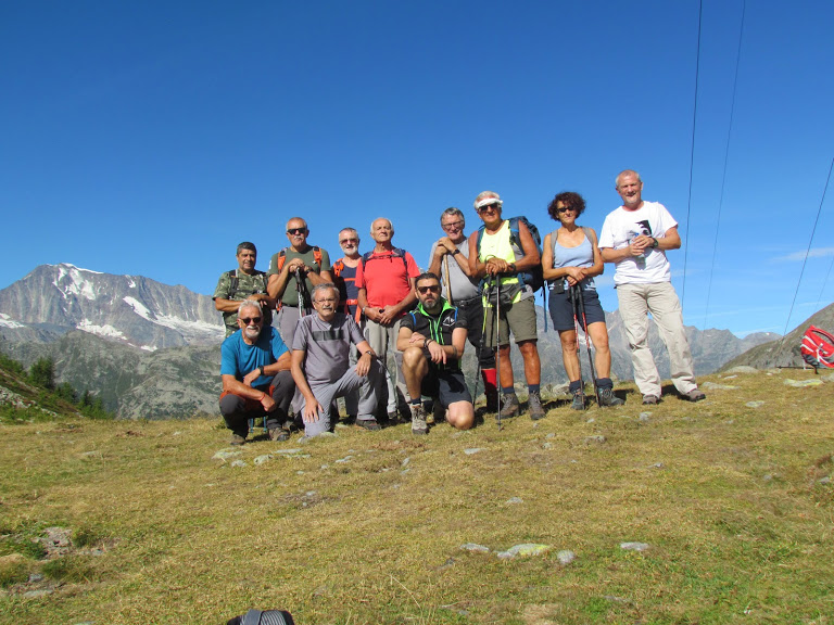 In una bella giornata di fine agosto dieci ragazzi, in prevalenza pensionati, e la loro badante salgono a San Bernardo, 1628, e parcheggiano. Era da tempo che non ci permettevamo di lasciare gli ombrelli sulle auto. Lungo la gippabile per il Rifugio Gattascosa scendiamo ad attraversare il Rio Rasiga e risaliamo al rifugio Il Dosso e di qui all’Alpe Monscera, 1971, ed al passo omonimo, 2103. Dopo un’ora e mezza abbondante di cammino tranquillo ci concediamo una pausa in religiosa contemplazione delle meraviglie che ci circondano. Alleggeriamo gli zaini in previsione di ridiscendere qui, dove un amico esordiente meno allenato ci aspetterà. La sua decisione si rivela subito di grande saggezza in quanto il sentiero s’inerpica quasi subito dal passo di Monscera, in presa diretta verso nord est, lungo la linea di confine italo – svizzera.