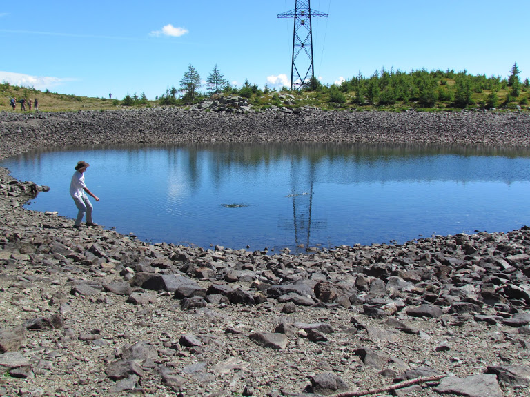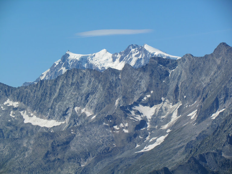 Per smaltire gli eccessi culinari della sera precedente un pensionato ossolano inserisce la sesta e ci abbandona ad arrancare faticosamente sul ripido pendio. Quando lo raggiungiamo in vetta al Pioltone o Camoscellahorn, 2612, dopo più di un’ora di sana fatica, sembra già annoiato e pronto a ridiscendere, nonostante la compagnia di capre invadenti e di stupendi panorami. Ci permettiamo una sosta consistente, fotografando e difendendoci a racchettate dagli assalti caprini. Molti escursionisti hanno deciso oggi, come noi, di soffrire sui ripidi pendii del Pioltone. Ripiombiamo rapidamente sul Monscera (mezz’ora) e sostiamo per il pranzo in riva a quel che resta del laghetto, dove un grande specialista novarese, che si allena in riva al Ticino, si esibisce nel lancio radente sull’acqua di piccole pietre piatte e tondeggianti, facendole rimbalzare da una sponda all’altra.