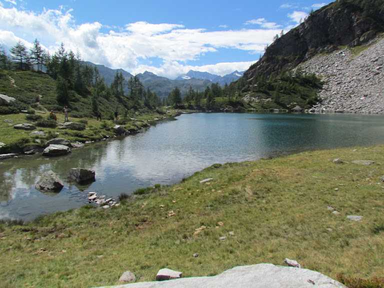 Riprendiamo la via del ritorno e, sotto l’Alpe Monscera, propongo agli amici una comoda variante che, almeno oggi, viene apprezzata. Imbocchiamo un sentiero sulla sinistra che risale per qualche decina di metri fino ad incontrare l’evidente sentiero che dall’alpe porta al Lago d’Agro, 2022, secondo me erroneamente chiamato Lago d’Arza sulla cartina CAI più aggiornata. Diretti a nord est raggiungiamo lo splendido laghetto in tre quarti d’ora dal laghetto di Monscera. Dopo la meritata contemplazione viriamo a sud e, in mezz’ora, chiudiamo il piccolo anello odierno sulla gippabile poco sopra l’Alpe Arza e il Rifugio Il Dosso. Proseguiamo per San Bernardo tagliando, grazie al sentiero, qualche tornante. Al rifugio in prossimità del parcheggio brindiamo al compleanno dell’amico che, per smaltire l’eccesso di cibo, corre dal Monscera al Pioltone.