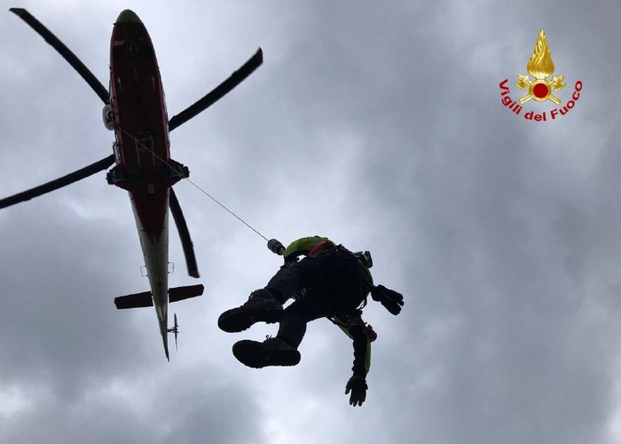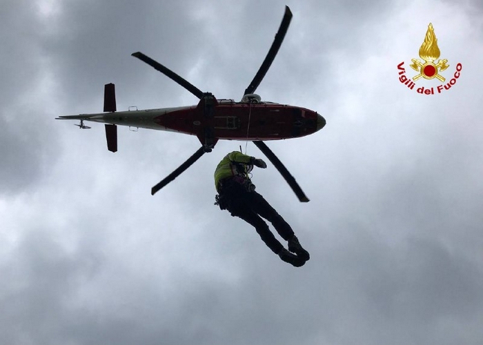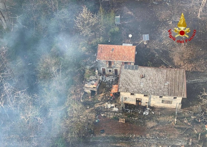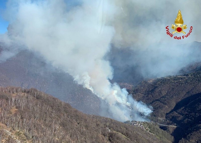 VALLE CANNOBINA - 07-04-2021 -- Sono sane e salve, trasportate a terra dall’elicottero dei vigili del fuoco, le persone che oggi pomeriggio hanno rischiato di restare intrappolate nel vasto incendio scoppiato nella bassa Valle Cannobina. Le fiamme che erano state contenute ieri, sono ripartite e dalla zona di Ponte Spoccia si sono propagato verso valle, minacciando alpeggi e rustici per evacuare i quali è stato chiamato l’equipaggio del Drago 80. L’elicottero di stanza a Malpensa ha preso il volo diretto in Cannobina e, sia atterrando, sia intervenendo con un operatore calatosi col verricello, hanno soccorso tre persone e un cane, condotte a valle in una zona sicura.