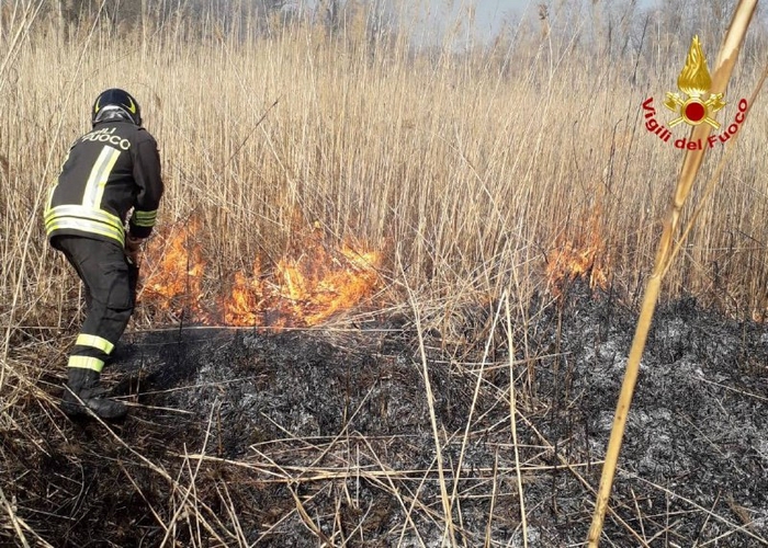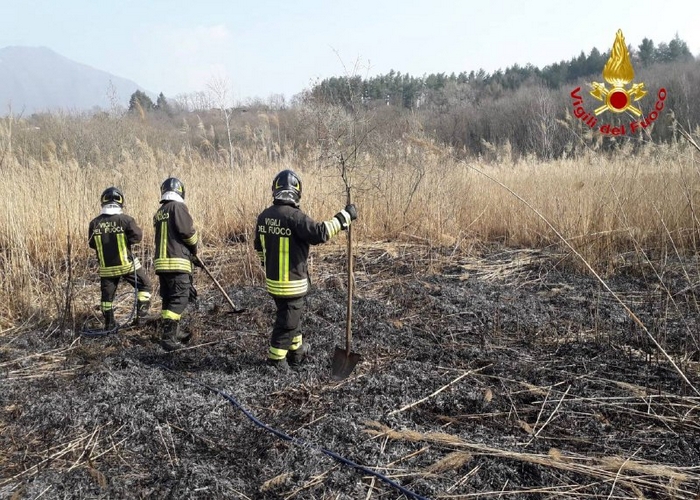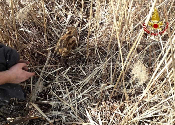 LAVENO M. - 04-03-2022 -- Hanno spento le fiamme e salvato un cucciolo di cinghiale che rischiava di bruciare. S’è risolto in poco tempo, nel primo pomeriggio di oggi, l’incendio che ha interessato parte del canneto della torbiera di Laveno Mombello. I vigili del fuoco, intervenuti con un’autopompa e un fuoristrada hanno contenuto le fiamme e, durante la bonifica, si sono imbattuti in un cinghiale di pochi mesi, che è stato liberato.