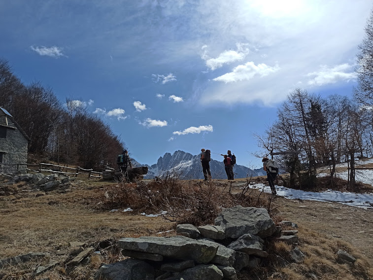 A quota 1300 incrociamo la strada che da Alagua sale verso Coipo e Giovera. La percorriamo in salita fino all’Alpe Buscain, porta d’accesso al bellissimo altopiano di Coipo, dove ci concediamo un giro esplorativo con percorso libero. Torniamo sulla strada prima di Cascine Bertolini e qualcuno apre l’ombrello sotto due gocce di pioggia trasportata da occidente, dove un po’ di neve sta imbiancando leggermente le cime più alte, con qualche mese di ritardo.