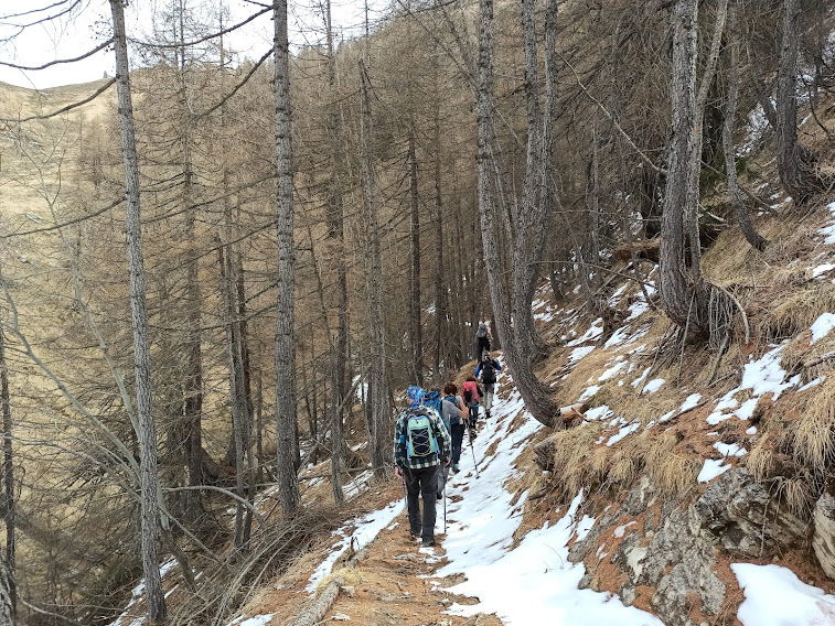 Fra i cinque maschietti ci sono due medici di turno ed un anziano ex istruttore di sci taroccato. Il sole è un po’ velato, in attesa di una lieve perturbazione da ovest che, a fine gita, mi consentirà di accompagnare una badante sotto il mio ombrello per qualche minuto.