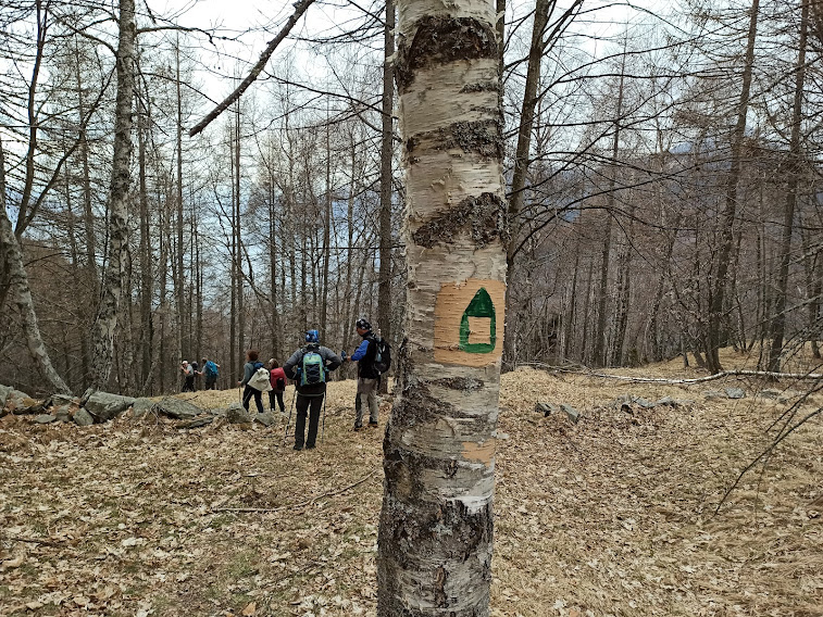Fatichiamo inizialmente a seguire la traccia, che diventerà poi sentiero evidente con indicazioni circolari verdi. Le cartine più aggiornate (si fa per dire) ignorano questo percorso, indicato invece su cartine più vecchie. Ma adesso ci sono le piste agro-silvo-pastorali che spesso sostituiscono i sentieri e costituiscono le vere priorità. E’ il triste trionfo della montagna motorizzata su quella calpestata solo dagli scarponi.