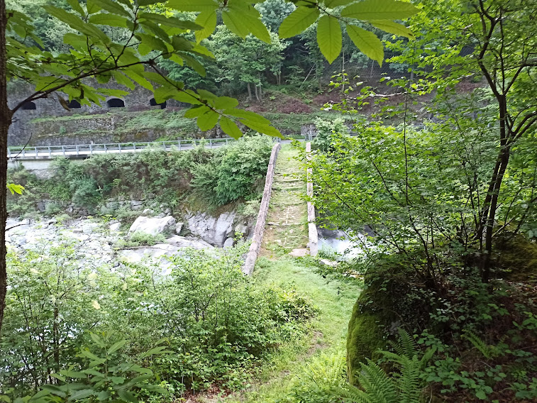 Diretti a sud raggiungiamo rapidamente la cava dismessa, 415, in corrispondenza di un altro ponte. Di qui si sale anche agli alpeggi di Algnime e Nugno. Dopo un breve strappo in salita si scende dolcemente fino al ponte romano chiamato Ponte Nuovo (mezz’ora). Qui si deve scendere di una decina di metri e proseguire sul sentiero basso. Troviamo un altro breve strappo in salita e poi leggeri saliscendi in questo tratto piuttosto accidentato sulle enormi frane che, abbinate alle piene del Diveria, cancellarono nel 1951 e 1958 la frazione di San Giovanni.