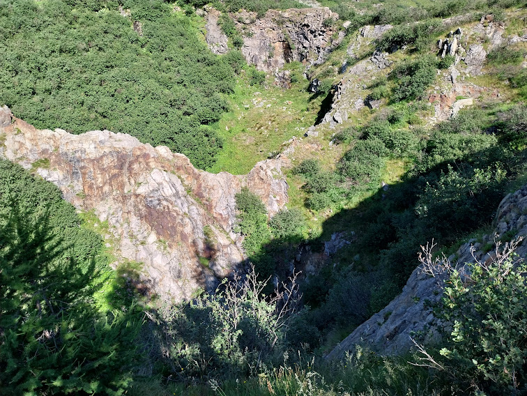 In morbidissima salita raggiungiamo la zona dell’Alpe Freghera di Mezzo, 2000 circa, dove è ancora visibile, alla destra del nostro sentiero G35, l'enorme voragine conica della cava, dalla quale il materiale confluiva nella sottostante galleria di carico dei carrelli ferroviari. Sempre lungo leggeri saliscendi raggiungiamo la splendida conca dell’Alpe Freghera di Sopra, 2080, dove sostiamo. A sud ovest ci domina la Bocchetta del Gallo, incastonata fra la Cima della Freghera e il Corno Orientale di Nefelgiù.