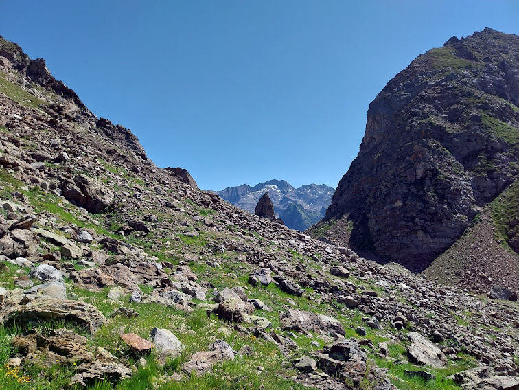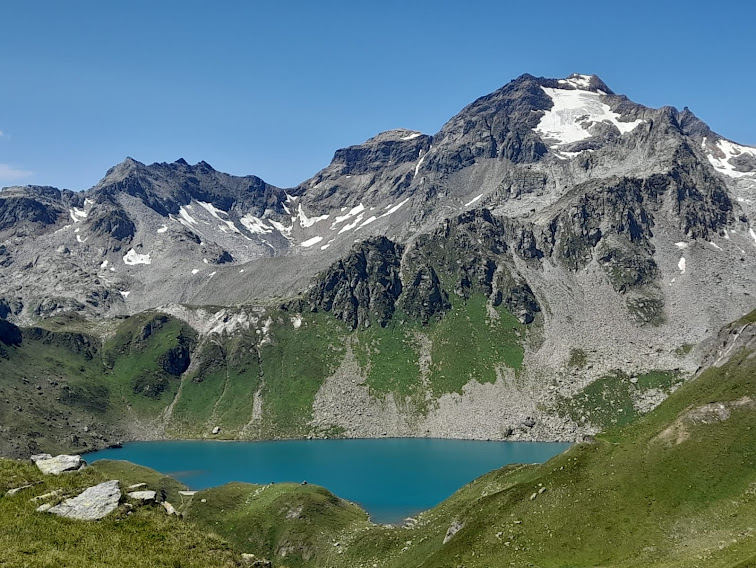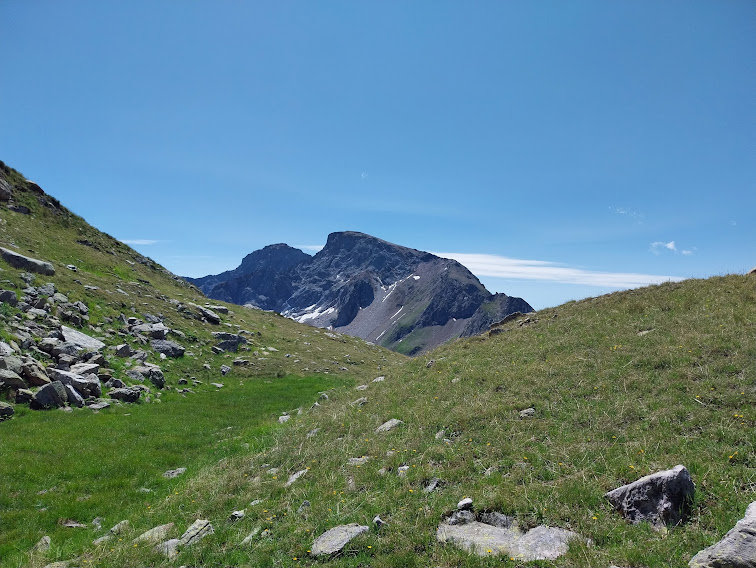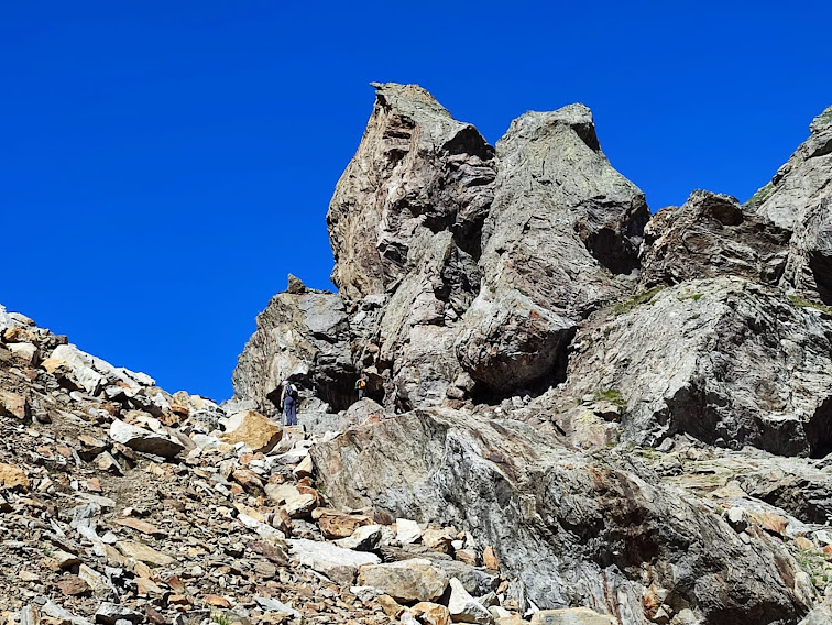 Qualche piccolo nevaio residuo ci conferma che l’inverno scorso è stato molto scarso di precipitazioni. Scendiamo con tranquillità lungo il sentiero G25 della GTA che percorre verso il Lago di Morasco, in direzione nord nord est, il Vallone di Nefelgiù. Qui siamo tornati in mezzo alla gente dopo i pendii deserti fra Bocchetta del Gallo e Passo.