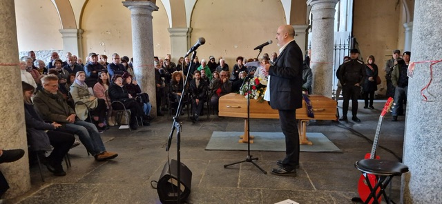 DOMODOSSOLA- 05-11-2023-- Domodossola ha salutato domenica pomeriggio il chitarrista Vic Vergeat. Sotto i portici di teatro Galletti si è tenuta la cerimonia laica, a cui hanno partecipato anche musicisti ossolani con i quali ha collaborato nel corso della sua lunga carriera artistica. Sono migliaia i messaggi di condoglianze giunti alla moglie Carmen Corradini, noto medico domese.