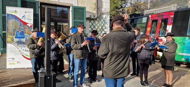 OSSOLA- 25-11-2023-- Un treno speciale è partito dalla stazione della Vigezzina a Domodossola questa mattina alle 8.54 ed è salito fino a S.M.Maggiore con a bordo le autorità. Si tratta del clou delle celebrazioni per il centenario di fondazione della Ferrovia Vigezzina. La prima parte ufficiale delle celebrazioni si è svolta presso la stazione di Santa Maria Maggiore.