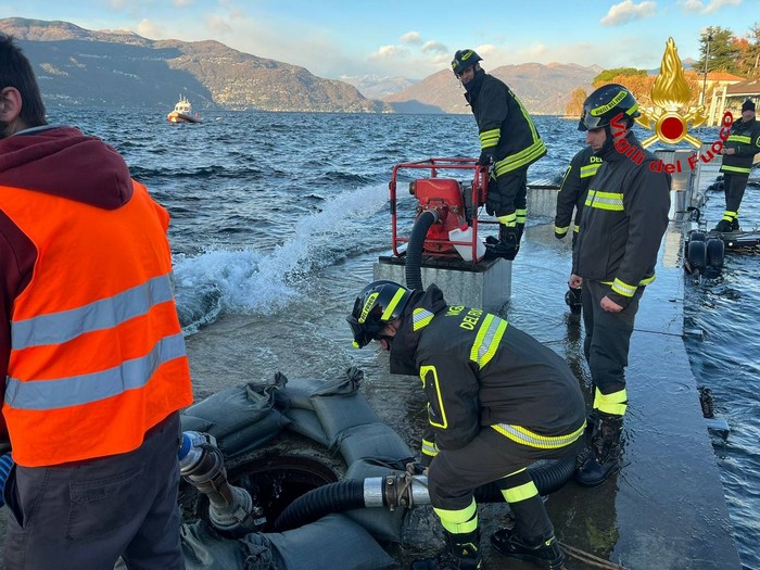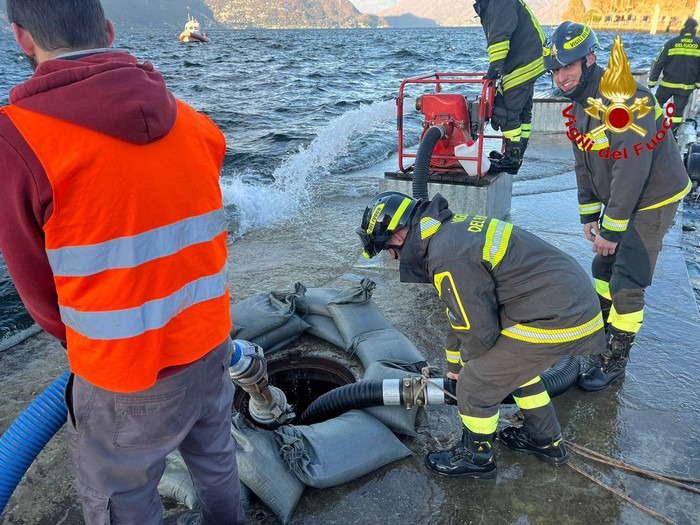 PORTO V. - 25-11-2023 -- Il tempestivo intervento dei vigili del fuoco, che con diverse motopompe hanno svuotato le casse di galleggiamento, ha permesso di "salvare" la struttura portuale di Porto Valtravaglia, sulla sponda lombarda del Lago Maggiore. Nella giornata di oggi i soccorritori sono stati allertati perché i pontili galleggianti stavano sprofondando verso il fondale per via dell'acqua entrata -per motivi ancora da chiarire- nelle casse, fungendo da zavorra anziché da galleggiante.