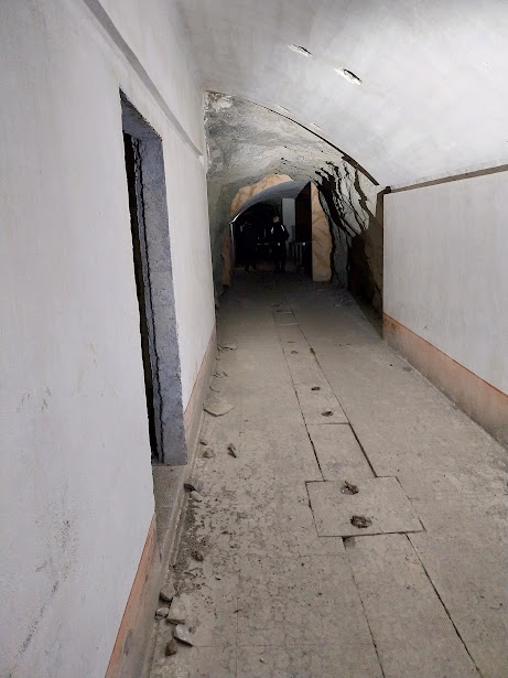 Dopo meno di un’ora siamo davanti all’ingresso della fortificazione, poco sopra quota 600, di fronte alla Centrale di Iselle e all’ingresso della Galleria del Sempione. L’accompagnatore, nella sua duplice funzione di guida e di medico competente, ci fa vestire di tutto punto e controlla le dotazioni di pile e frontalini. L’interno è per tutti una bella sorpresa. Lunghissimi corridoi, locali laterali, postazioni per i cannoni, scale: tutto in buono stato di conservazione. Viene spontaneo chiedersi perché un simile tesoro storico non venga fatto conoscere e valorizzato. Pensiamo alle fortificazioni appena aldilà della frontiera. E dire che sono lì da quasi un secolo. Il tempo non mancava.