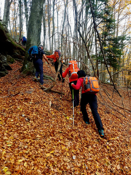 La traccia è molto ripida, piuttosto impervia. Breve sosta in prossimità di una cappella a quota 800 circa. Più avanti si intravvede il baratro alla nostra destra e si scollina su terreno più aperto, raggiungendo l’Alpe Corcino (o Ciorcino), 1000 circa (poco più di un’ora dal fondovalle). Ci domina a sud il Pizzo Rovale. Siamo in ritardo sulla tabella di marcia, anche per la lunga visita al forte, e cambiamo il programma, rinunciando alla salita a Selvanera di Dentro. Saliamo ancora nel bosco di faggi con percorso libero, in direzione sud est, guidati soltanto da chi conosce il territorio.