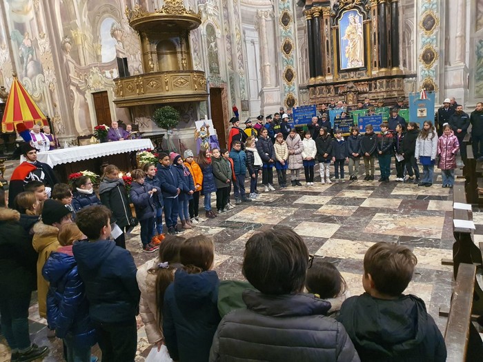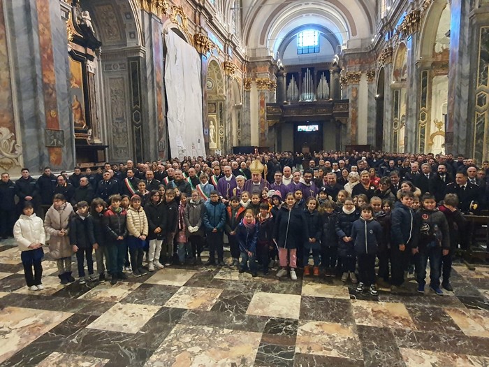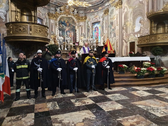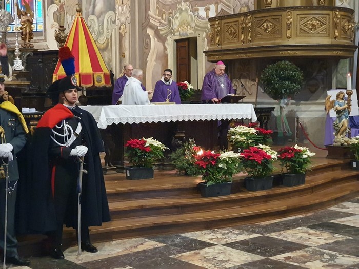 VERBANIA - 20-12-2023 -- C’erano anche i bambini delle vicine elementari rosminiane al precetto natalizio delle forze dell’ordine che, stamane, ha riempito la basilica di San Vittore. Guardia di finanza, carabinieri, polizia di Stato, polizia penitenziaria, vigili del fuoco e polizia locale erano presenti in massa -insieme alle associazioni combattentistiche e d’arma- alla cerimonia presieduta dal vescovo Franco Giulio Brambilla. Un anticipo di Natale che il vescovo ha legato all’ottocentesimo anno di vita del presepe, che realizzò per la prima volta San Francesco nel 1223. Il prefetto Michele Formiglio ha rivolto un saluto e un augurio, sottolineando l’importanza delle forze dell’ordine.