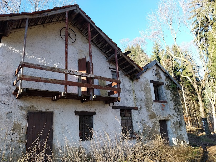 Oltrepassiamo la Cappelletta Canà, 850, ed una radura dove sono ammassati dei tronchi. Poco sopra raggiungiamo i ruderi dell'Alpe Giardino, 890 secondo l'indicazione, ma probabilmente ben oltre i 900. Camminiamo da un'ora e un quarto. Qui, nel 2014, oltre a tanta pioggia ricordavo una bellissima pineta, adesso molto diradata. Breve pausa e raggiungiamo rapidamente La Borromea, 980, dove passa anche la strada a pedaggio che sale al Mottarone da Gignese, in prossimità della Fonte Vitaliana.