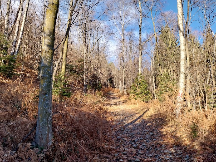 C'è un edificio con bar che sa di nuovo e un'area ricreativa che è anche un bellissimo punto panoramico verso il Lago. Qui c'era la stazione di partenza della vecchia funicolare, smantellata nel 1963. Dopo una breve pausa fotografica proseguiamo lungo l'antica massicciata del trenino a cremagliera che sale in direzione nord ovest, diritta in mezzo al bosco. Passiamo poco dopo in prossimità dell'Oratorio di Sant'Eurosia (Eutosia secondo il cartello indicatore) del 1541 e ne visitiamo i ruderi.