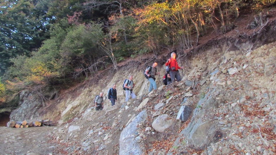 Qui l'ultima parte di sentiero è distrutta e resa pericolosa da massi e terra caduti dalla sovrastante strada in costruzione. E' una tecnica costruttiva, o meglio “distruttiva”, più economica di quella prevista solitamente. Siamo tornati bruscamente con i piedi per terra. Stanchi ed incazzati ripieghiamo mestamente verso la strettoia di Massiola.
