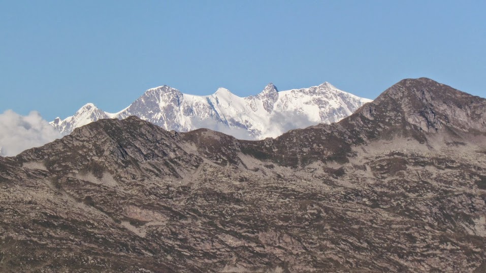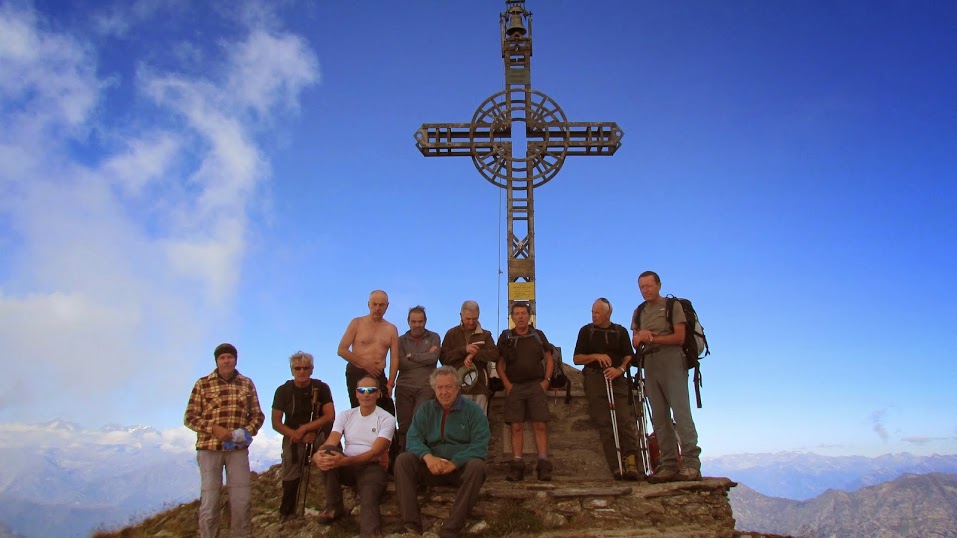 Lo sguardo sale verso l'Alta Ossola ed oltre, fino ai Mischabel: tutto è dominato dal Rosa. Che meraviglia! Qualche foto e si riparte in direzione nord, diretti all'ancora lontana Cima Scaravini, 2119, che conquistiamo dopo quasi un’ora e mezza. Breve pausa tecnica e si riparte in direzione est lungo la cresta a cavallo fra Strona e Ossola. Si perdono circa cento metri su una traccia che segue inizialmente la cresta stessa, poi passa sul versante sud (Strona) e porta, con qualche “sali-scendi”, alla vetta del Monte Massone, 2161. Nell’ora scarsa da Scaravini a Massone è necessaria una certa attenzione. Si sta addensando qualche nuvola e subito ripartiamo in direzione sud lungo un sentiero segnato che ci porta all'Alpe Torriggia, dove si pranza.