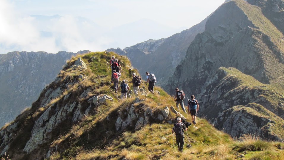 Autunno: conviene partir presto. Noi, oggi in undici con il piccolo Willy bau, forse esageriamo. Alle 7 a Massiola, 775, servirebbe quasi la pila. C'è un comodo parcheggio ad ingresso paese, ma, ancora semi-addormentati, ci avventuriamo verso il centro lungo una strada stretta che richiede il “ritiro” degli specchietti retrovisori. Il coraggio viene premiato da un altrettanto comodo parcheggio che ci permette di risparmiare quasi dieci metri di dislivello. Imbocchiamo la bella mulattiera verso la Cima Scaravini, o Scaravine, che si trasforma presto in sentiero e dopo meno di mezz’ora siamo all'Alpe Crotta, 975.