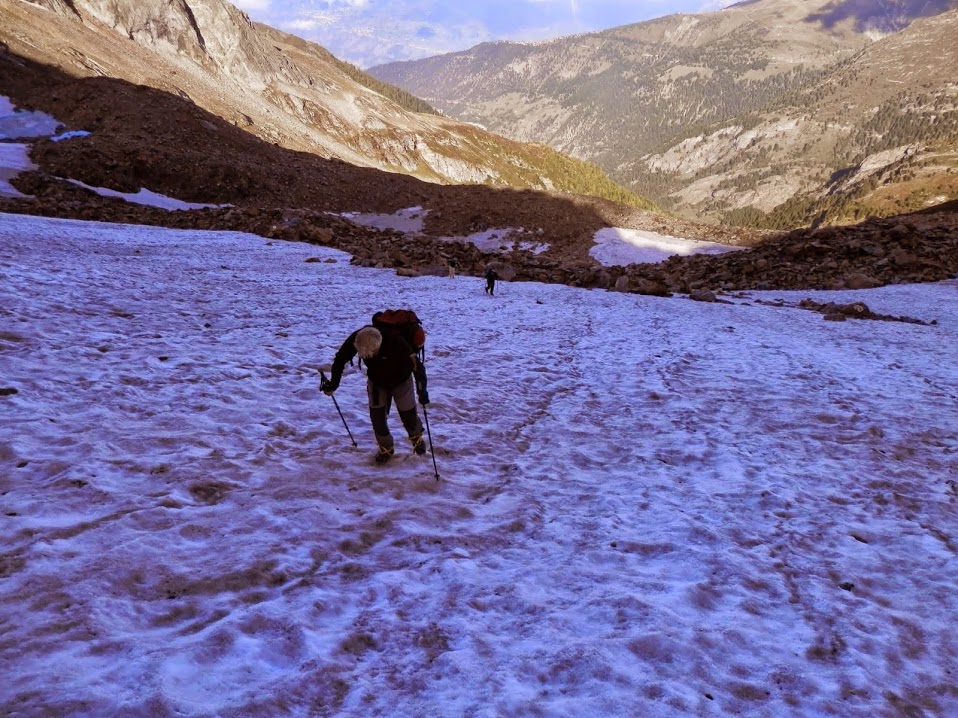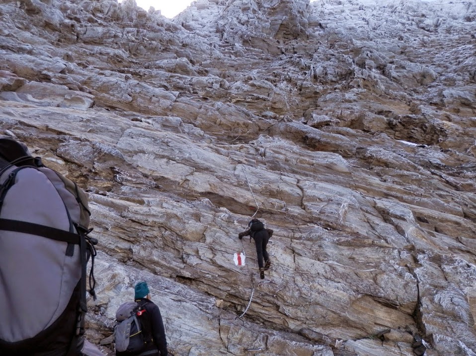 Su questo versante ovest a quest'ora non batte ancora il sole e le cime leggermente imbiancate danno vita ad uno scenario surreale, nel contesto di un panorama stupendo, che ci gustiamo facendo colazione. Breve tratto in leggera discesa e calziamo i ramponi per risalire un nevaio ripido con neve molto dura, dove occorre la giusta attenzione per le scariche di sassi, soprattutto quando si alza la temperatura. A fine nevaio inizia un tratto attrezzato con scalette e catene per facilitare la risalita. Tutto facile, ma c'è ghiaccio anche sui gradini d'acciaio e qui ci dividiamo.