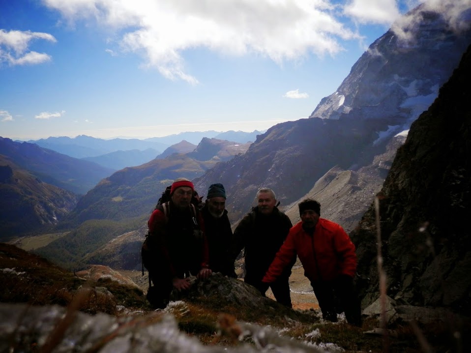 Finalmente s'inizia a salire veramente per combattere un po' il freddo e l'umidità che ci entrano nelle ossa, alla faccia di Meteosuisse. Camminiamo da un'ora quando incontriamo i ruderi delle baite di Scheene Biel, 2268. Siamo nell'anfiteatro di Furggubäum, che dà il nome alla bocchetta ed alla punta, per noi “d'Aurona”. Continua la lotta fra nebbia e sole. Finalmente, dopo due ore di marcia, il sole la spunta, a quota 2500 circa, dove incontriamo un rudere in prossimità di un laghetto semi-ghiacciato. Ieri, a quest'altezza, c'è stata una leggera spruzzata di neve che, nella notte, si è trasformata in ghiaccio.