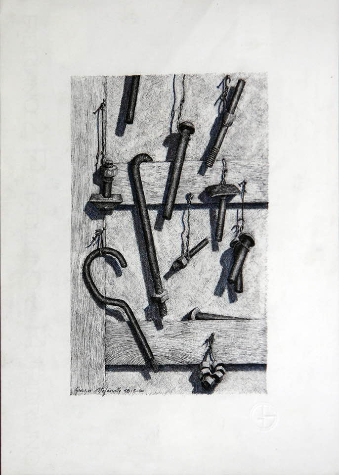 Sono in esposizione 35 opere a china di Giorgio Stefanetta, impreziosite da qualche tocco di pastello, che ritraggono dettagli di macchinari: ingranaggi, bulloni, pulegge, bilancieri, caviglie, chiavarde e altre attrezzature provenienti dalla storica “Bolloneria A. Morino & C.” di Vogogna. Questa fabbrica, purtroppo chiusa da alcuni anni, è stata per tutto il secolo scorso la realtà economica e trainante non solo per uno dei più incantevoli borghi d’Italia, ma anche per l’Ossola.