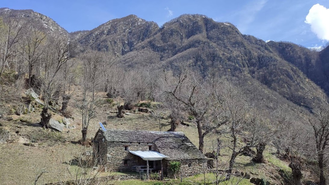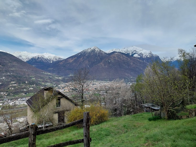 I panorami sull'Ossola sono sempre più spettacolari con tanta neve sopra i 1600 metri. Siamo sull' “Itinerario da Cosa a Cosasca tra luoghi di culto e insediamenti antichi”, come recitano i cartelli indicatori. Dopo tre quarti d'ora di cammino effettivo siamo a Cosasca, 550. Giriamo ammirati per l'antico borgo, in ordine, pulito, dove c'è vita. Proseguiamo verso nord fino al Santuario della Madonna delle Grucce, ristrutturato in stile “moderno”, e riprendiamo a salire su terreno più aperto fino all'Alpe Prà Lavarda, 775 (tre quarti d'ora). Ci domina a oriente la splendida dorsale sulla quale si trovano l'Alpe Drisioni e l'Alpe di Nava, quasi mille metri più in alto.