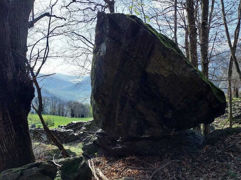 La neve ancora abbondante sopra i milleseicento metri, anche più bassa sui versanti nord, esalta queste meraviglie. Il nostro passo tranquillo si adegua a tanta bellezza. Merita foto un enorme masso che sembra in bilico a fianco del sentiero. Virando a nord est e passando dall’Alpe Bartolo, dopo poco più di un’ora e un quarto di cammino effettivo da Colloro, ecco Capraga, 951. Ci accolgono due vacche Highlander scozzesi con tipico fairplay anglosassone. Ci dirigiamo adesso verso nord, nuovamente sul sentiero A36, verso l’Alpe Pianoni. Il tutto dopo un tentativo fallito su un sentiero più in alto.