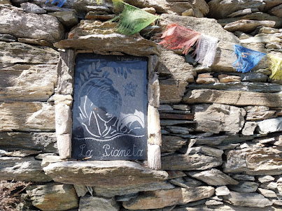 E’ diretto a sud est, molto ripido, da percorrere con normale attenzione, ma non lo definirei “pericoloso”. Ci porta all’Alpe Pianetta o La Pianeta, come qui si legge. C’è una baita aperta, un piccolo “Museo”, tutto è pulito e ordinato. Complimenti a chi la mantiene così e si fida del prossimo! Il sentiero confluisce sull’ A36, che coincide con la pista sterrata fra Capraga e Sasso Termine. Una grande lastra lucida di sasso ci dice che siamo sul “Gir di Crau”. Noi teniamo la sinistra (oriente) ed arriviamo a Sasso Termine, 954. Qui c’è tanto sasso, baite in piedi e diroccate. Una che mostra solo cemento sembra un pesce fuor d’acqua.