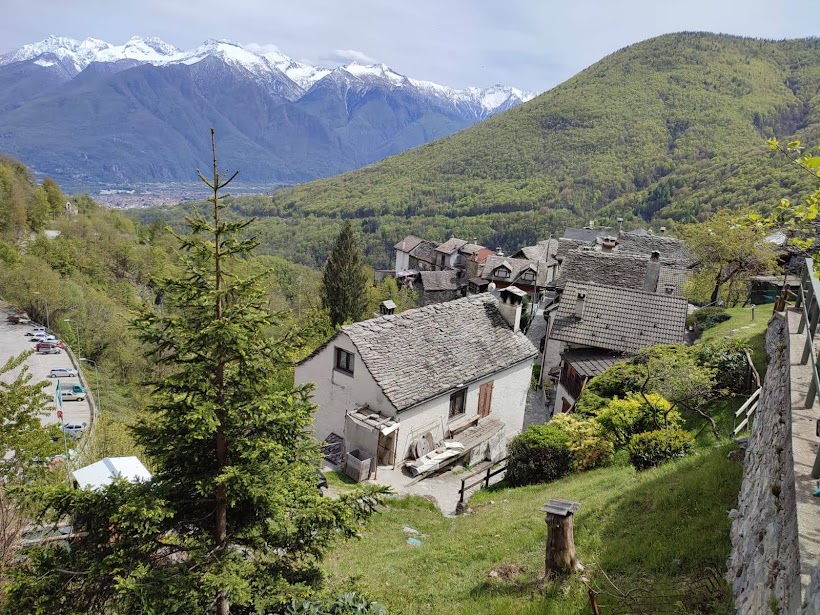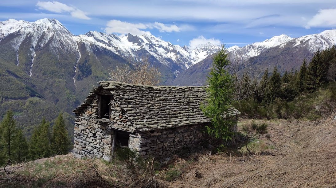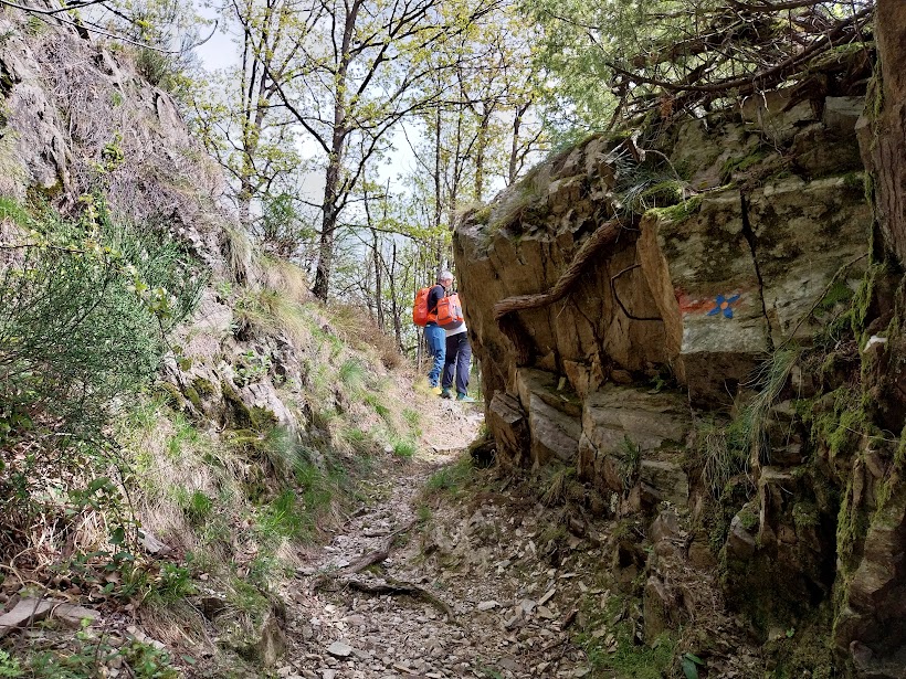 Parcheggiamo a Mocogna, 330, al di là del ponte sul torrente Bogna, finalmente ricco di acqua (non per molto), nonostante l’homo idroelettricus prediliga la Val Bognanco per i suoi “prelievi” di oro bianco non propriamente conformi alla legge. Dopo la chiesetta di San Rocco, in prossimità della fontana imbocchiamo la bella mulattiera, in dolce salita verso Cisore. Giunti alla cappella dedicata a Felice Previdoli, lasciamo la mulattiera, che sarebbe il percorso più comodo, e prendiamo il sentiero sulla destra. Ad un tavolo in pietra, che probabilmente serviva per appoggiare il carico e rifiatare durante la salita, teniamo la sinistra. Arriviamo ad un gruppo di case parzialmente diroccate. Invece di andare alla chiesa di Sant'Andrea lungo la trattorabile a destra, proseguiamo diritti costeggiando un'azienda agricola, dei prati ben tenuti con filari di vite, dei bei terrazzamenti.