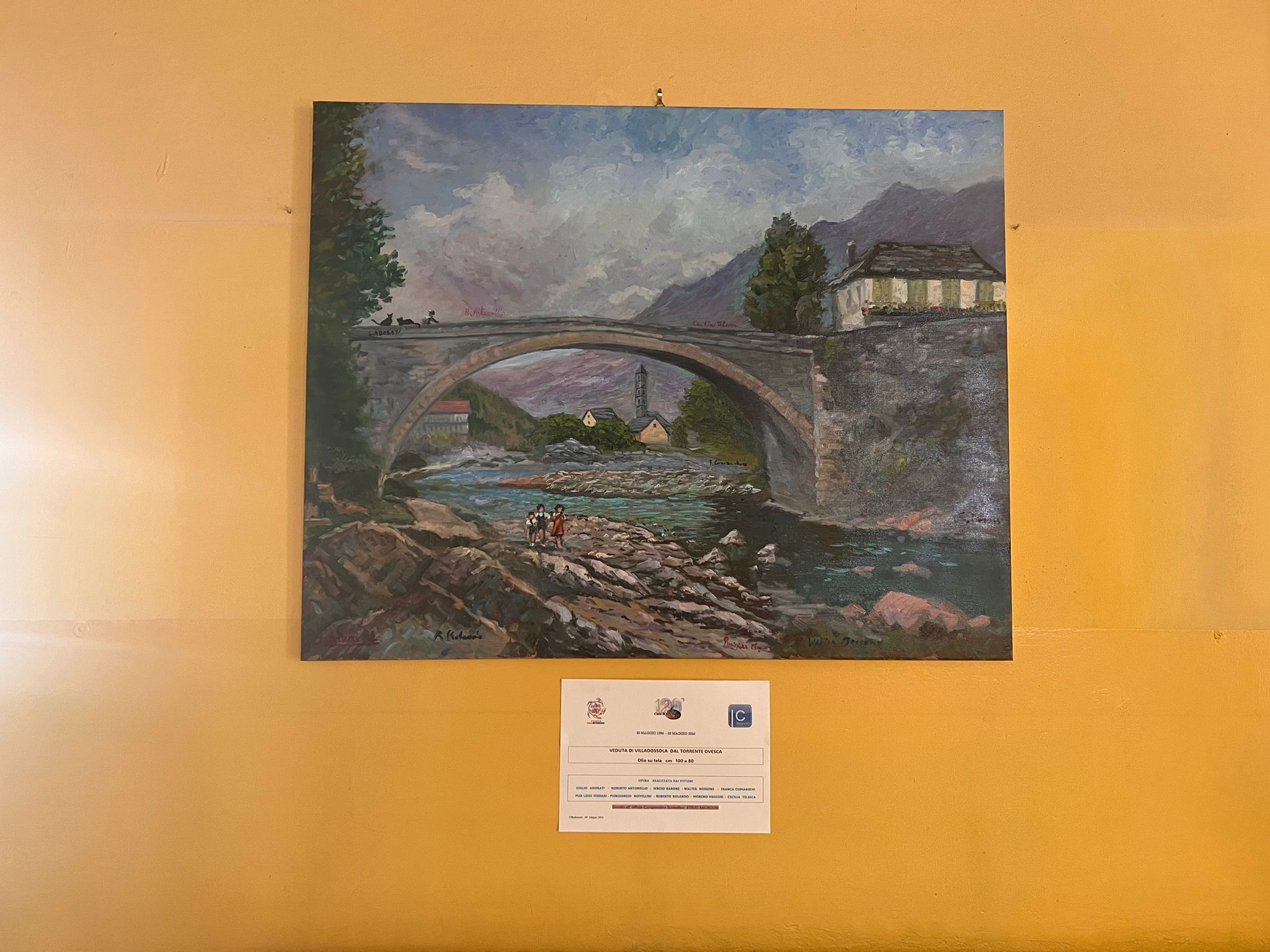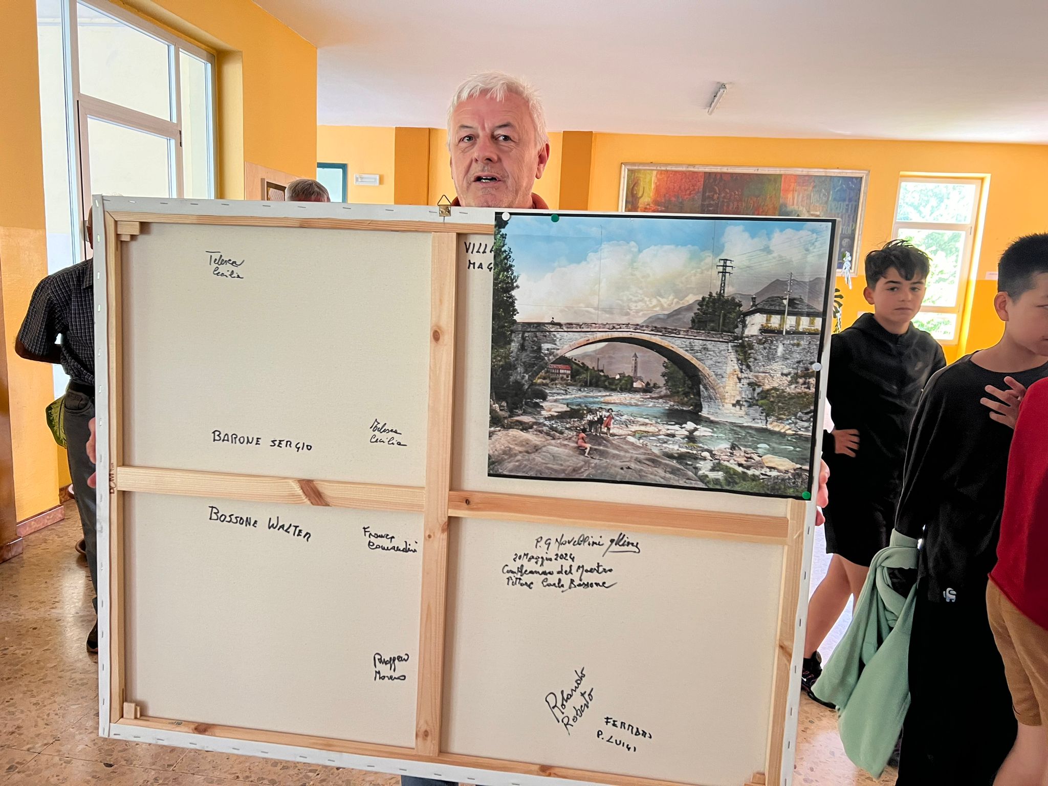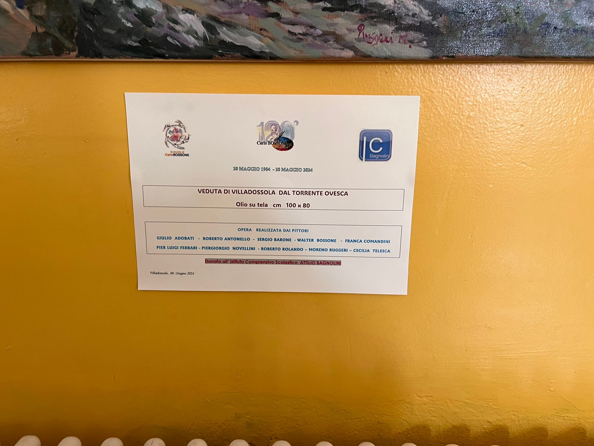 VILLADOSSOLA - 7-6-2024 -- Giovedì 6 giugno si è svolta all’Istituto Comprensivo Bagnolini di Villadossola la cerimonia di consegna di un quadro realizzato a più mani dai pittori allievi e seguaci di Carlo Bossone. Presenti i nipoti del famoso pittore e alcuni autori. L’idea è nata da una vecchia foto, si sono chiesti come avrebbe dipinto Carlo e hanno diviso la tela in più sezioni, ognuno ha lavorato su un riquadro. Il Dirigente Scolastico Dott.ssa Stefania Rubatto ha ringraziato i presenti per il quadro regalato e si auspica di vedere presto un’opera realizzata dagli alunni della scuola. Prossimamente il quadro andrà all’asta, ma non sarà spostato dalla scuola, il ricavato andrà all’Istituto Bagnolini per supportare le attività dei ragazzi che rappresentano il futuro.