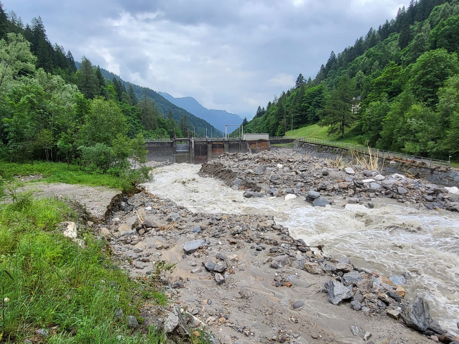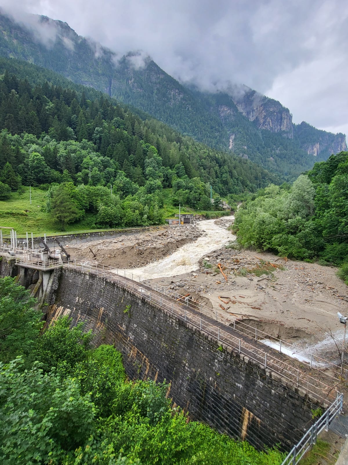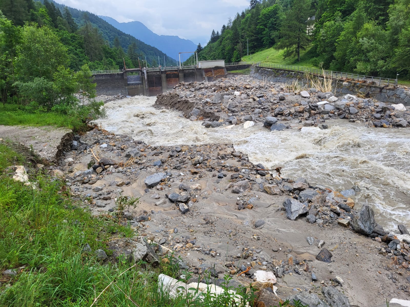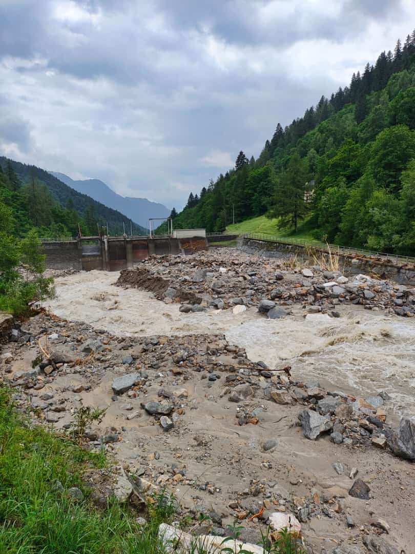 SAN DOMENICO- 30-06-2024- In attesa dell’inizio dei lavori di sgombero dei detriti traportati dallavfrana caduta venerdì nel tardo pomeriggio nella zona dopo la stazione di partenza degli impianti di risalita di San Domenico, sulla strada per l’Alpe Veglia, a Ponte Campo, attesi per lunedì mattina dalla ditta Dremar, ecco la situazione della sottostante diga di Gebbo, dove il rio Cairasca in piena ha trasportato molto materiale, sassi e fango.