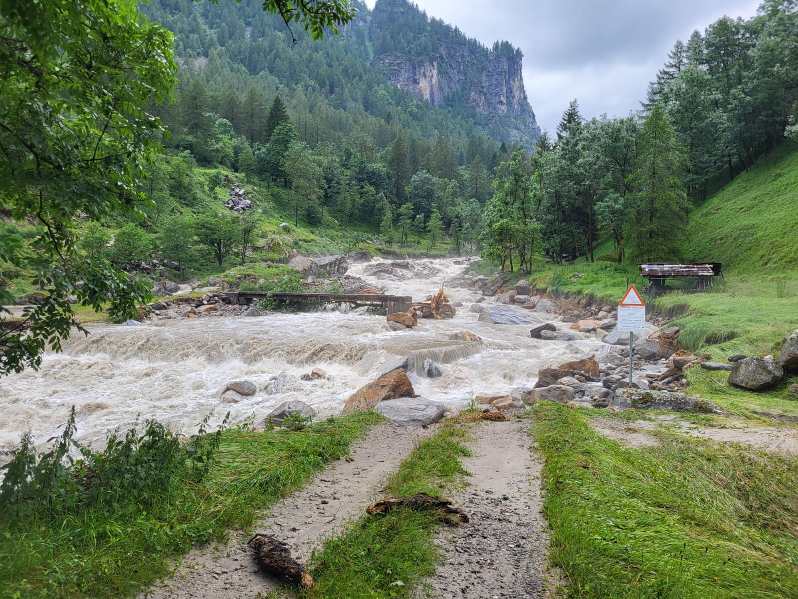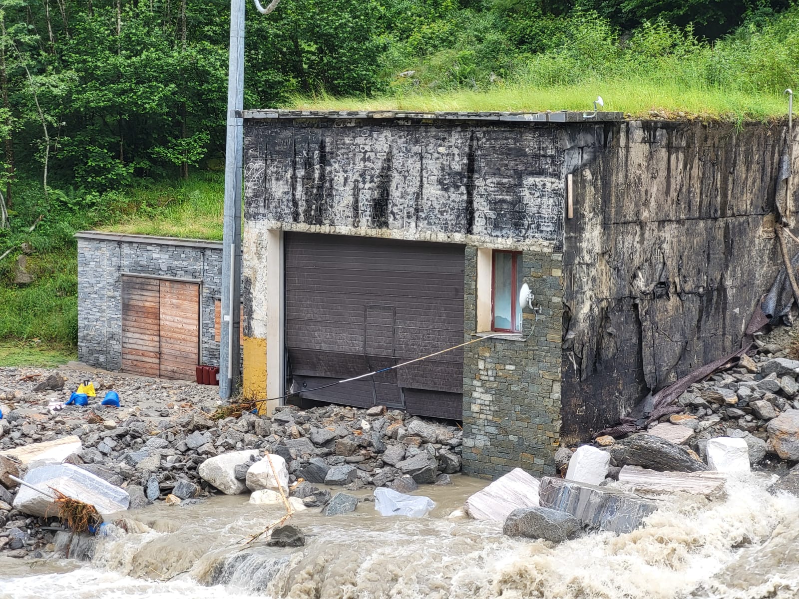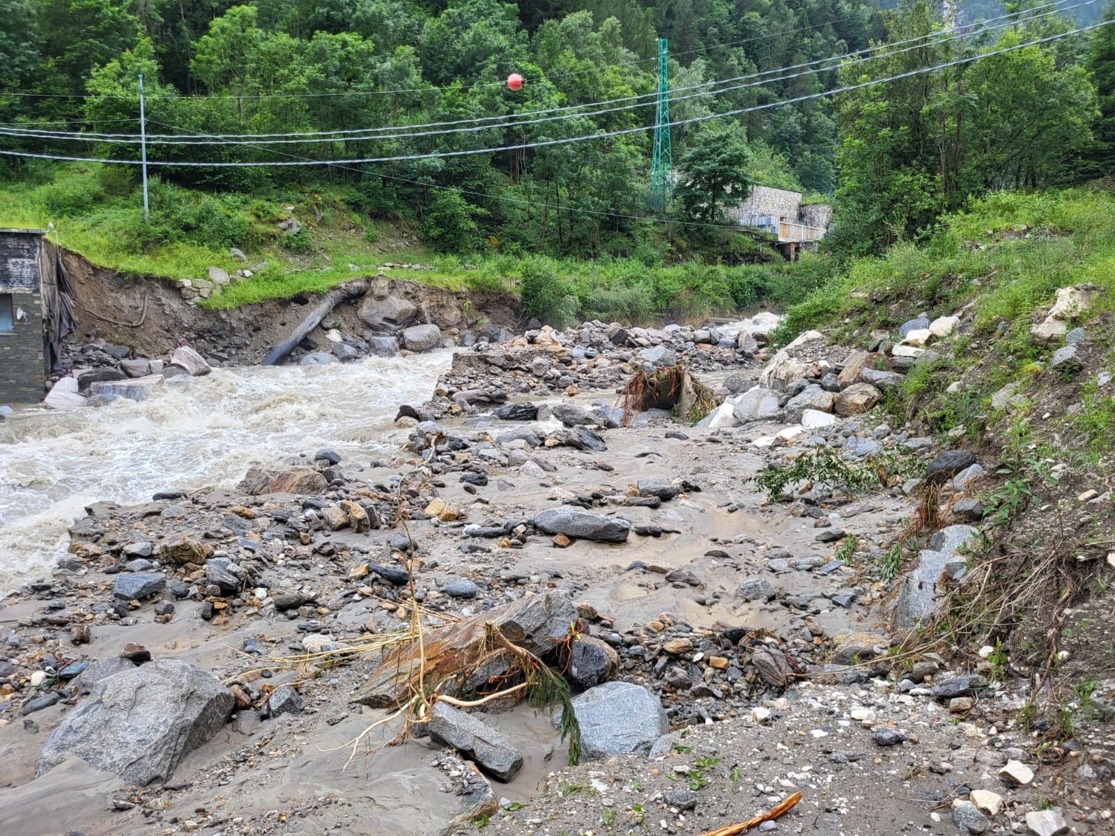 SAN DOMENICO- 30-06-2024- In attesa dell’inizio dei lavori di sgombero dei detriti traportati dallavfrana caduta venerdì nel tardo pomeriggio nella zona dopo la stazione di partenza degli impianti di risalita di San Domenico, sulla strada per l’Alpe Veglia, a Ponte Campo, attesi per lunedì mattina dalla ditta Dremar, ecco la situazione della sottostante diga di Gebbo, dove il rio Cairasca in piena ha trasportato molto materiale, sassi e fango.