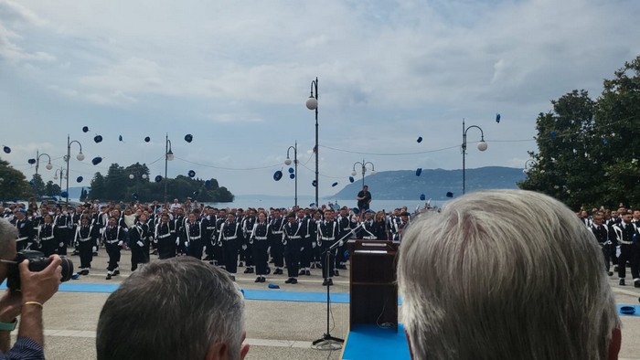 VERBANIA - 06-07-2024 -- Era presente anche il sottosegretario alla Giustizia, Andrea Delmastro Delle Vedove, al giuramento della polizia penitenziaria che stamane ha chiuso il 183° corso tenutosi alla scuola Salvatore Rap di Verbania. Alla cerimonia tenutasi sul lungolago il rappresentante del governo è stato accompagnato da Rita Monica Russo, direttore generale della Formazione al Dipartimento dell’Amministrazione penitenziaria, dal vicecapo Dipartimento Lina di Domenico e dal direttore della scuola Andrea Tonellotto. Il comandante Marco Mostacciuolo ha comandato il reparto durante la cerimonia che, alla presenza di un folto pubblico, s’è conclusa con il giuramento e con il classico lancio in aria dei baschi.