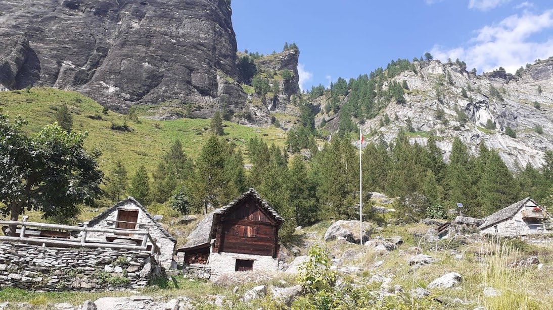 Questo è un terreno interessantissimo dal punto di vista speleologico. Qui vicino, infatti, si trova la “Voragine di Poiala”, considerata fra le più belle grotte del Piemonte. Breve pausa e invertiamo la rotta decisamente verso sud. Strada e poi sentiero H08, molto aereo nell’ultimo tratto a picco sul Lago di Agaro, ci portano all’Alpe Bionca o Plaangee, 1992, con tre caratteristiche baite a tetto semicircolare, attaccate fra loro.