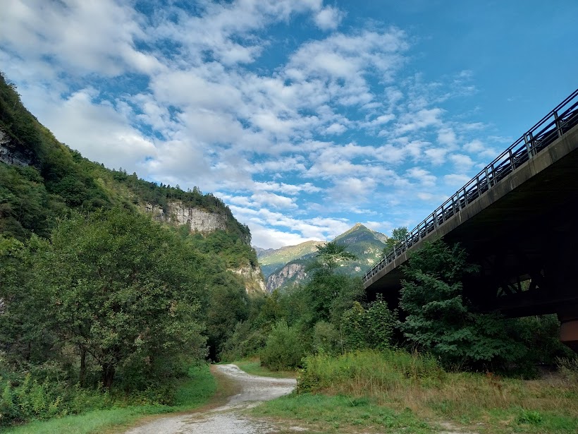 La quinta badante, assente da tempo, “bada” al marito, insieme al quale ci raggiungerà direttamente a Selvanera, salendo dall’Alpe Salviggia. Caffè in centro a Varzo, dopodiché portiamo due auto alla centrale ENEL di Ponte Cantone in previsione del ritorno ed andiamo a parcheggiare all’altezza dei campi sportivi, in frazione Riva, sotto il viadotto della V(vergognosa)S33, a quota 475. Attraversiamo il Diveria sul Ponte della Polveriera e imbocchiamo il sentiero F01 che ha come meta finale il Passo dell’Acqua Fredda e il bivacco di Pian Pumper.