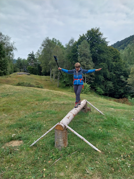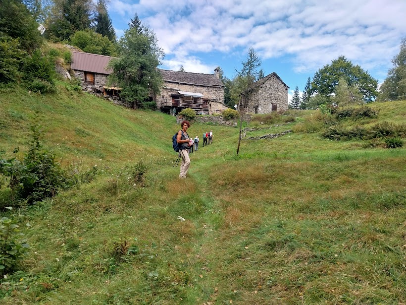 La discesa lungo il sentiero GTA, prima pianeggiante in direzione ovest ed un po’ esposto e poi in ripida discesa verso l’Alpe Salviggia, induce i nostri medici a sottoporci preventivamente ad un alcol test su un asse d’equilibrio predisposto allo scopo. Superato il test, raggiungiamo Salviggia e da qui, in parte lungo la strada e in parte lungo il sentiero per evitare le due gallerie, Ponte Cantone (un’ora e un quarto), dove ci aspettano le auto parcheggiate al mattino.