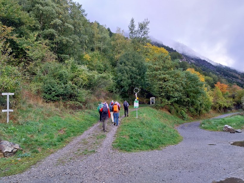 E ha smesso di piovere: porteremo gli ombrelli a spasso dentro lo zaino per l’intera giornata, con nebbia, vento fresco e persino un po’ di sole. E’ stata comunque scelta l’opzione 2, programmata in caso di maltempo, da quota 600 a quota 1570. L’opzione 1, programmata per tempo bello, prevedeva partenza da Jeizinen, quota 1570, e giro ad anello fino a quota 2400.