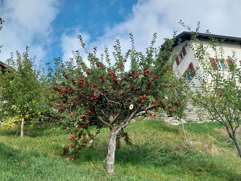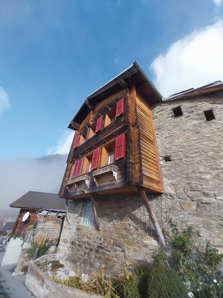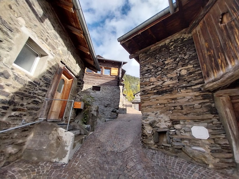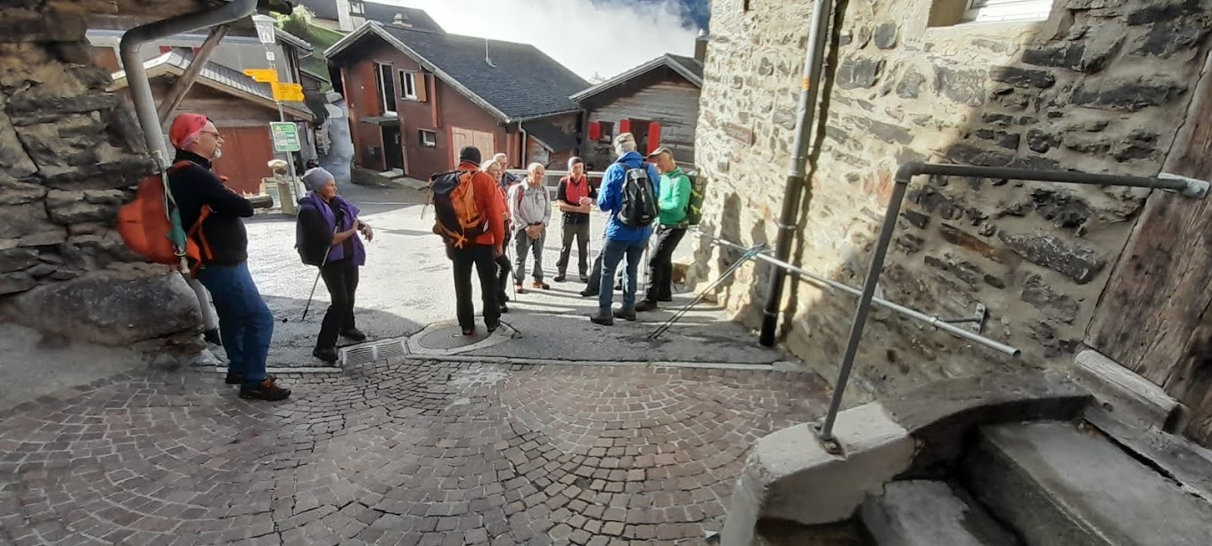 Più in alto torniamo sul sentiero “sicuro” e viriamo nuovamente a occidente. Mentre splende il sole e ci rinfresca il vento, dopo un’ora e tre quarti da Bratsch, arriviamo nel paesino da favola di Jeizinen, 1570. Qui c’è la casa di uno dei nostri due ospiti. Le loro signore sono salite in auto e in funivia, rinunciando alla camminata, per prepararci un’accoglienza affettuosa ed eccezionale dal punto di vista eno-gastronomico. Il tempo vola e nel pomeriggio avanzato riprendiamo il cammino scendendo a Gampel in un’ora e tre quarti lungo la pista diretta, comoda ed evidente.