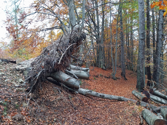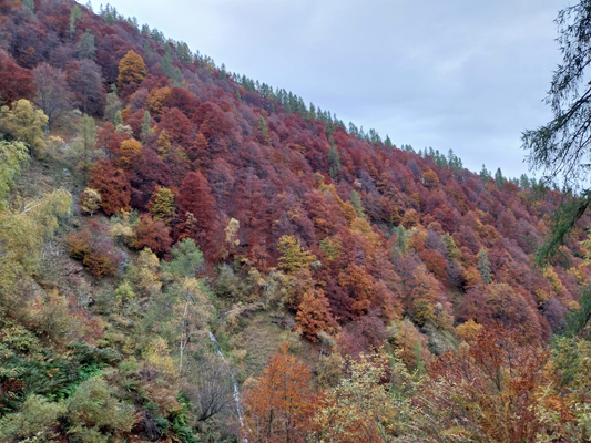 Per ora non piove e imbocchiamo il sentiero D09 che, diretto a sud, sale appena dietro il rifugio. Si alternano tratti ripidi ad altri pianeggianti. Inizia a piovere, non forte, ma quel tanto che basta per dover aprire l'ombrello. Si sta attenti alle foglie di faggio scivolose nei tratti più stretti del sentiero. I colori dell'autunno sono già esplosi e risplendono nonostante l'atmosfera nebbiosa e piovosa.