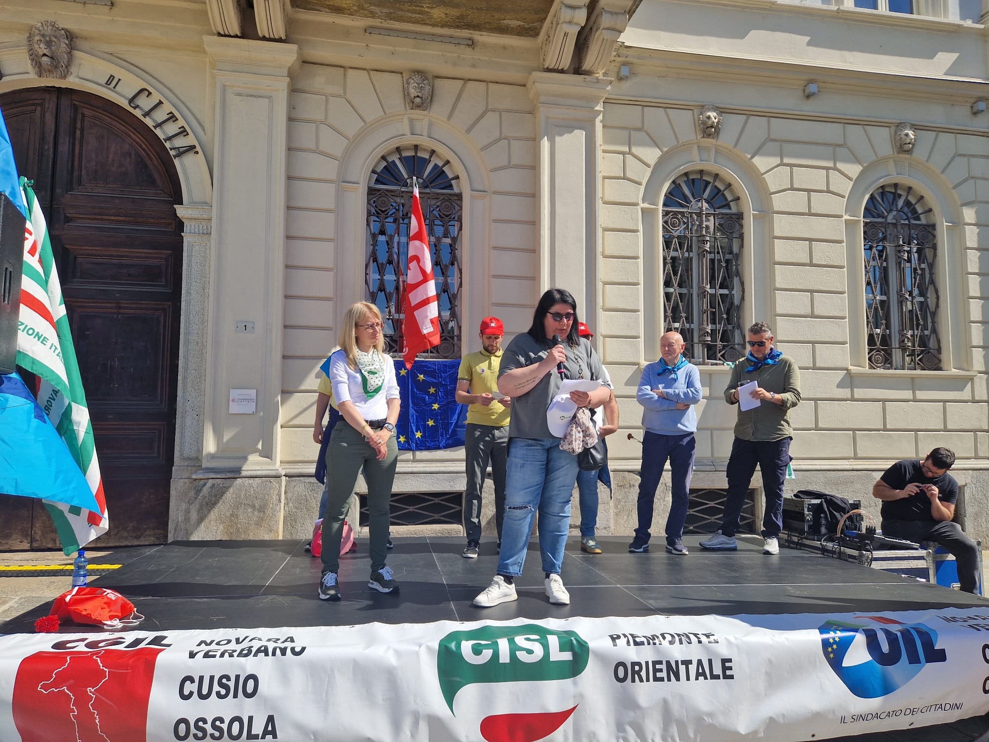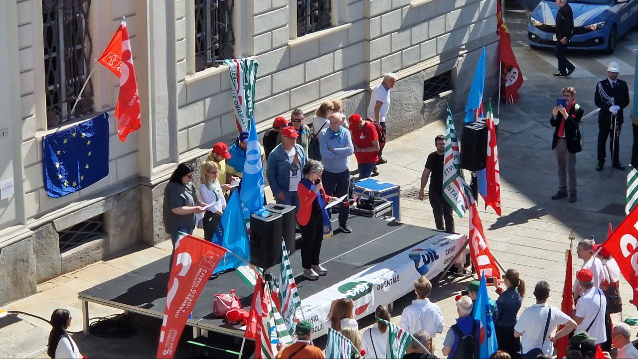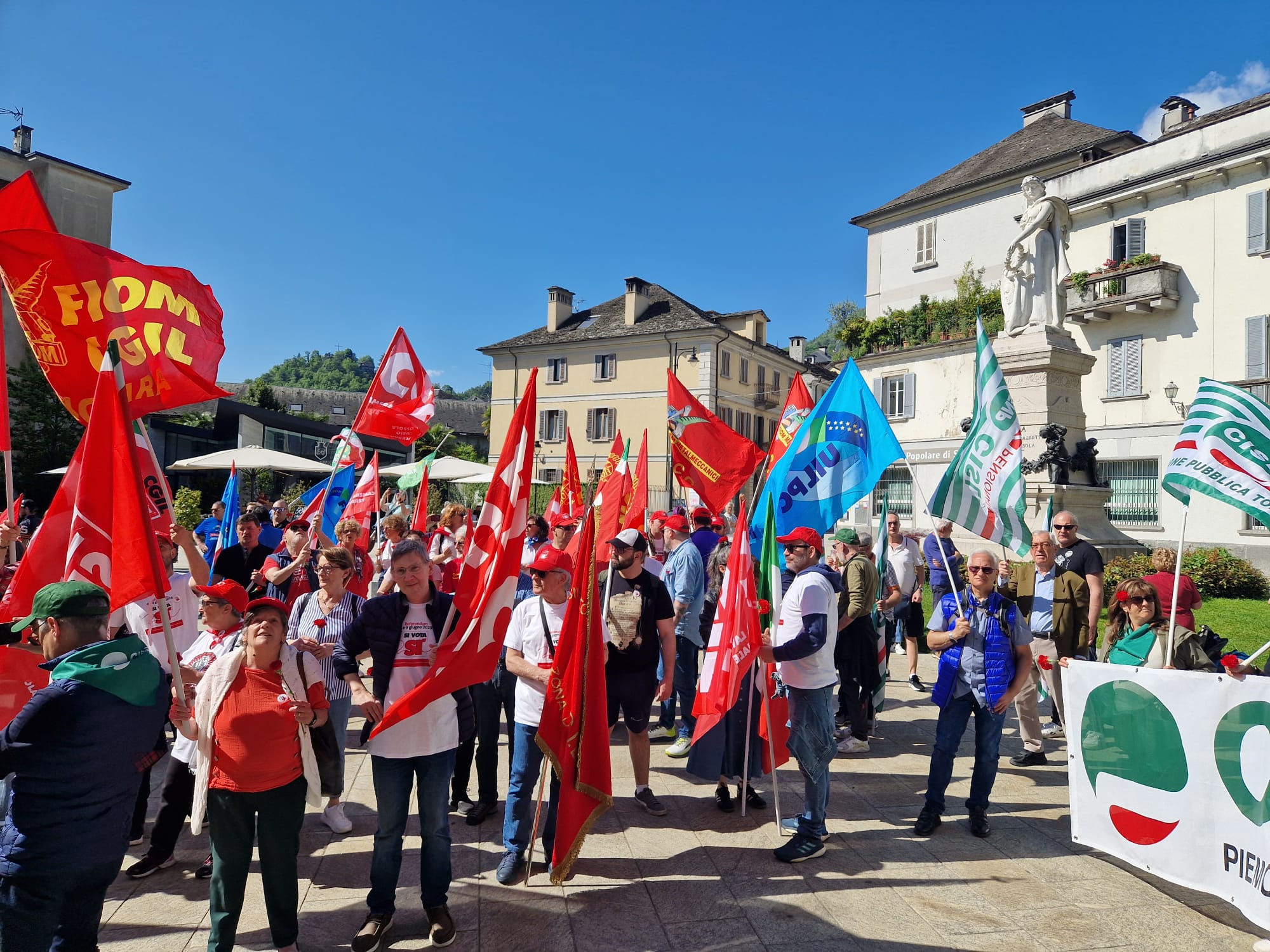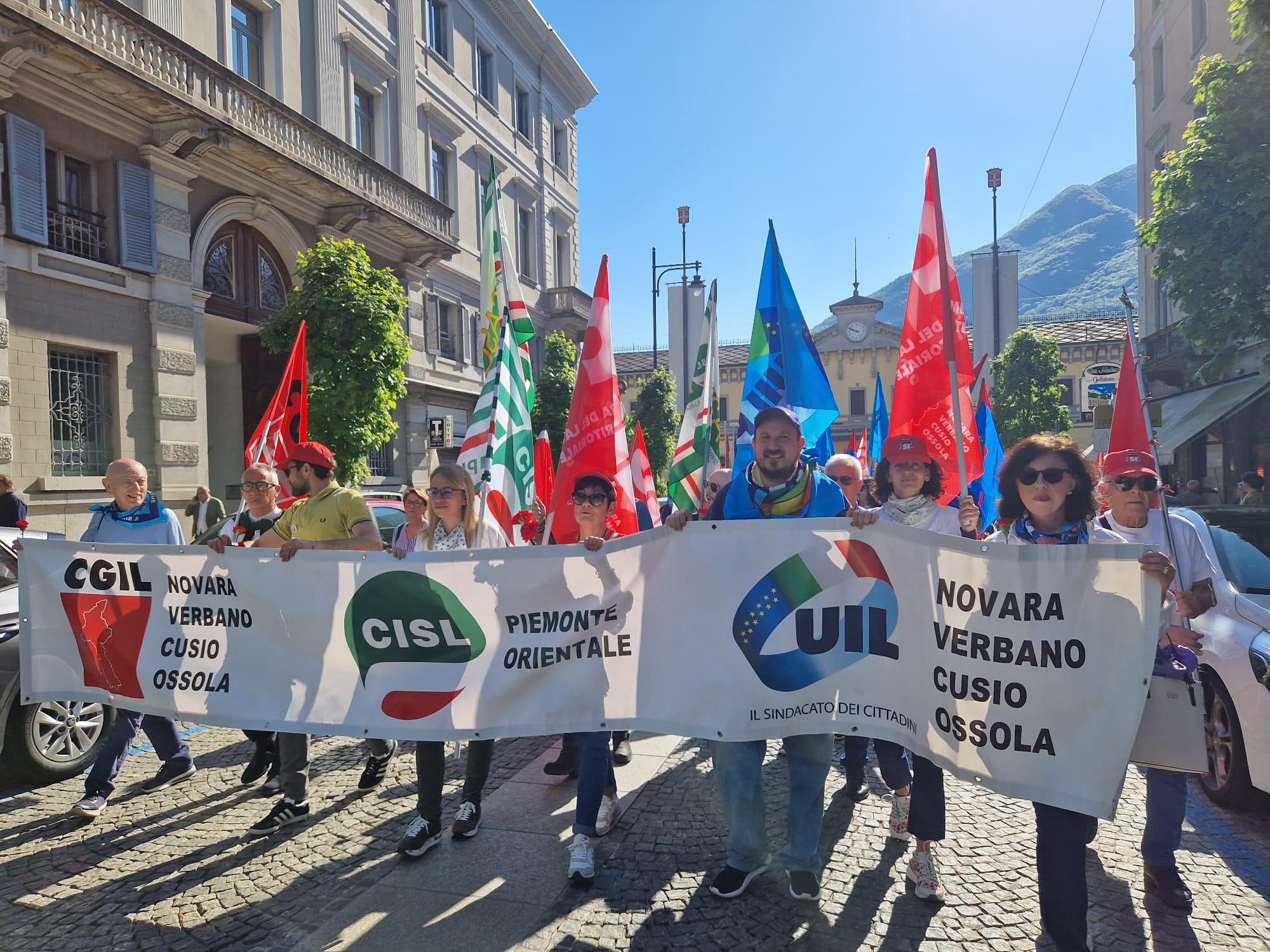 DOMODOSSOLA - 1-5-2025 -- Tanta partecipazione al 1° maggio di Domodossola: le bandiere della Cgil Cisl e Uil hanno sventolato per le vie del centro nel corteo che, dalla Stazione, è giunto davanti al Municipio per i discorsi ufficiali, dove si è notata l’assenza di una rappresentanza del Comune domese. Sul palco sono saliti rappresentanti sindacali e lavoratori che hanno testimoniato le difficoltà del mondo del lavoro odierno. Michele Piffero, segretario confederale Cgil Novara Vco ha fatto da moderatore. «Sicurezza ce n’è sempre meno nei luoghi di lavoro, 3 morti al giorno sabato e domeniche comprese. Nel Vco nel 2024 si sono registrati più di 1400 infortuni e 2 deceduti». Mimma Moscatiello, la delegata del presidente della Provincia del Vco, ha portato i sentiti saluti dell’istituzione. La segretaria generale di Cisl Piemonte Orientale, Elena Ugazio, ha introdotto la giornata. «Il tema della sicurezza sul lavoro è un’emergenza nel nostro Paese» ha detto. Roberto Vittorio (Uil Novara Vco) sottolinea: «Dobbiamo manifestare contro il degrado sui posti di lavoro, ci troviamo con aumento di perdite di vita e malattie professionali». Hanno preso la parola anche Vincenzo Frusteri Chiacchiera (rappresentante Uil Poste), Francesco Sasso (delegato sindacale Filt Cgil) e Rosella Criseo, rappresentante sindacale dello stabilimento della Barry Callebaut di Intra. Le conclusioni sono state affidate ad Alessandro Casellato, segretario generale Uiltec Piemonte, il quale ha voluto sottolineare che «il silenzio assordante delle istituzioni di Domodossola è grave». A conclusione della manifestazione un gruppo di membri del movimento Linea studentesca ha contestato le dirigenze sindacali e Confindustria. La giornata prosegue presso l’area feste della Lucciola di Villadossola che ospita la terza edizione del pranzo del lavoro con grigliate, dj set ma anche un momento per fornire i dati relativi al mercato del lavoro nel Vco.