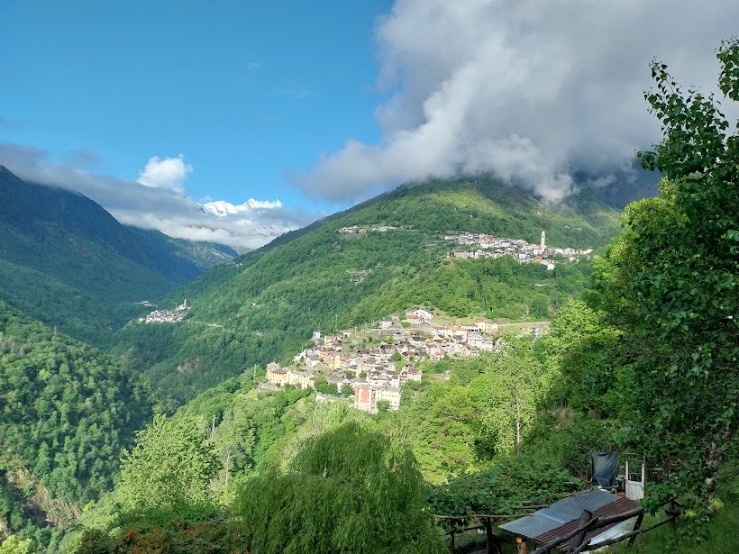 Solo il grafomane e una preziosa badante aderiscono oggi all'invito di un forte anziano, originario e, come tale, esperto di sentieri della Valle Antrona. Parcheggiamo nella parte alta di frazione Boschetto, primo nucleo abitato salendo da Villadossola, a quota 480. E' prevista pioggia a metà giornata, ma la guida di oggi fornisce ampie garanzie sulla brevità della gita e sulla comodità dei sentieri, che consentirebbero di tenere aperto l'ombrello. Per ora il sole fa capolino fra le nuvole basse, ben attaccate ai ripidi pendii circostanti.