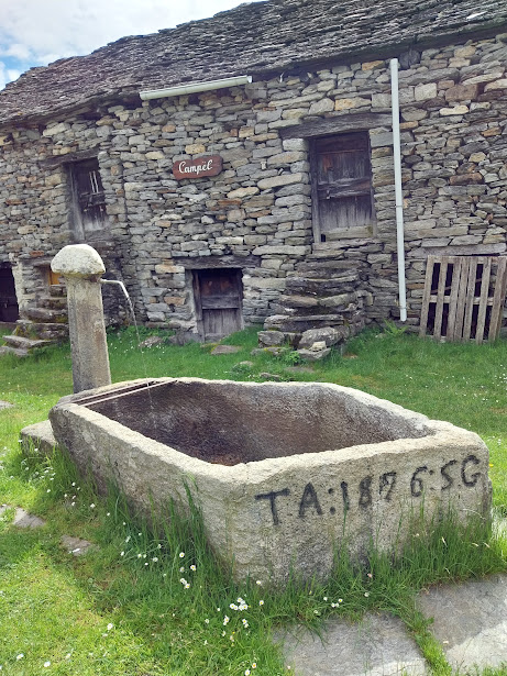 Lunga pausa per una meritata visita a questo bellissimo alpeggio sito su una dorsale che separa la valle del torrente Brevettola dalla valle del rio che raccoglie le acque del versante meridionale del Moncucco. Rivedo con piacere la splendida fontana del 1876 ricavata da un blocco unico di granito, monolitica nel vero senso della parola. Ripartiamo scendendo lungo il sentiero C04, che è quello seguito in salita ogni anno dal Lautani (o Autani) dei Sette Fratelli. Qui finalmente su terreno bello e facile, come spesso avviene, la nostra unica e quindi preziosa badante inizia gli allenamenti per la gara di tuffi dal trampolino di un metro delle prossime Olimpiadi. Per fortuna senza gravi conseguenze.