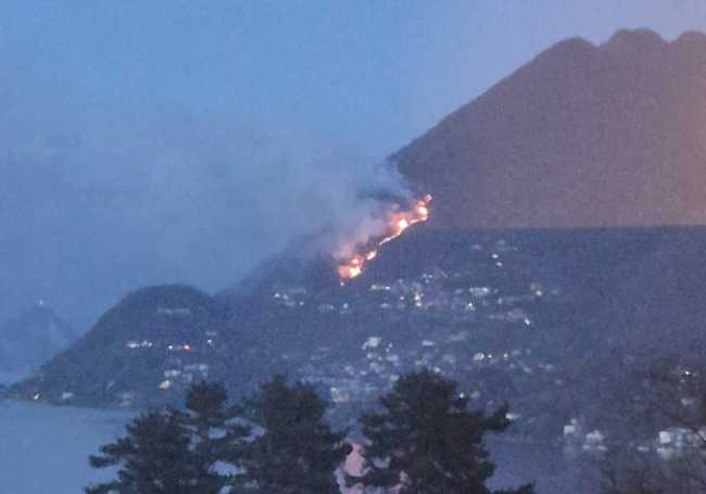 LAVENO- 04-04-2026-- Una clungua di fuoco che striscia sulla montagna nella notte del Lago Maggiore,